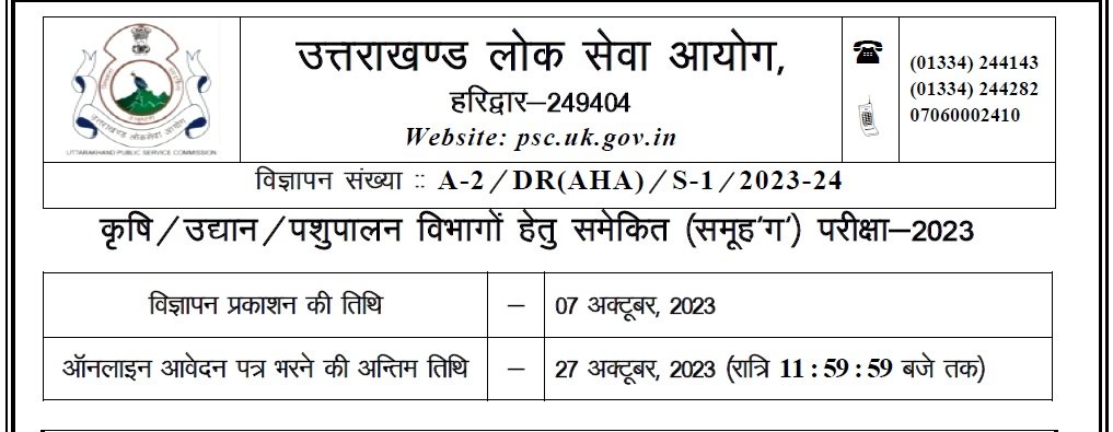 हरिद्वार : उत्तरखंड लोक सेवा आयोग ने बंपर भर्तियां निकाली हैं। समूह ग के पदों के लिए भर्ती का नोटिफिकेशन भी जारी कर दिया गया है। विज्ञापन संख्या A-2 / DR (AHA)/S-1/2023- 24 के माध्यम से कृषि / उद्यान / पशुपालन विभाग के अंतर्गत समूह ‘ग’ के कुल 645 रिक्त पदों पर सीधी भर्ती द्वारा चयन हेतु विज्ञापन की शर्तानुसार पात्र अभ्यर्थियों से आयोग की वेबसाईट www.psc.uk.gov.in पर दिनांक 07 अक्टूबर, 2023 से ऑनलाईन आवेदन-पत्र आमंत्रित किये जा रहे हैं। ऑनलाईन आवेदन-पत्र भरने की अन्तिम तिथि 27 अक्टूबर, 2023 (शुक्रवार) है। अभ्यर्थी ऑनलाइन आवेदन-पत्र भरने से पूर्व आयोग की वेबसाईट पर प्रसारित विज्ञापन में वर्णित समस्त शर्तों / निर्देशों का भली-भाँति अवलोकन अवश्य कर लें।