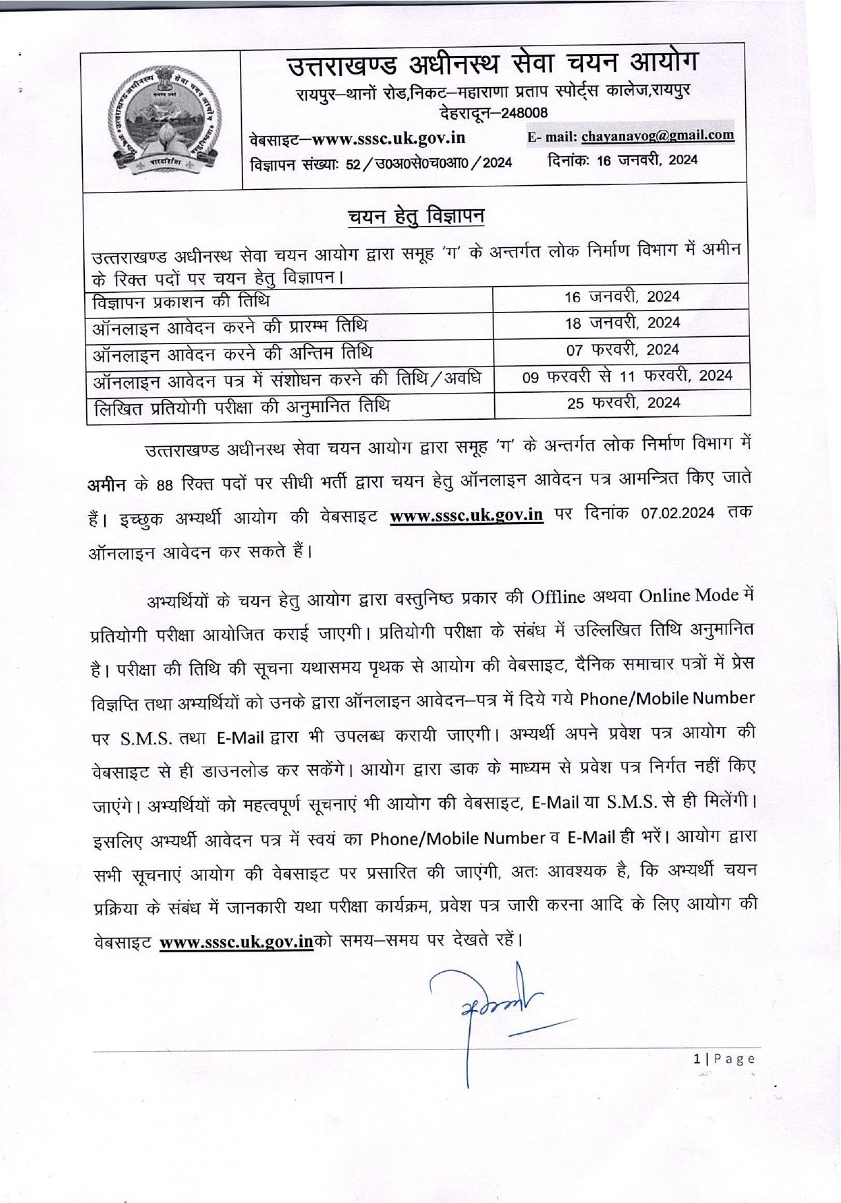 आयोग द्वारा सभी सूचनाएं आयोग की वेबसाइट पर प्रसारित की जाएंगी, अतः आवश्यक है, कि अभ्यर्थी चयन प्रक्रिया के संबंध में जानकारी यथा परीक्षा कार्यक्रम, प्रवेश पत्र जारी करना आदि के लिए आयोग की वेबसाइट www.sssc.uk.gov.inको समय-समय पर देखते रहें।