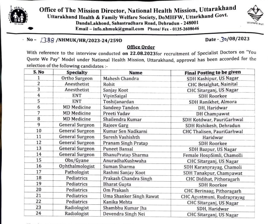 स्वास्थ्य विभाग लम्बे समय से राज्य के पर्वतीय जिलों में स्पेशलिस्ट और सुपर स्पेशलिस्ट डाक्टरों की कमी को दूर करने की कवायद कर रहा है।  जिसके पहले चरण में 24 डॉक्टरों का चयन किया गया है। इनमें पैथोलॉजिस्ट, गायनोलॉजिस्ट, एनेस्थेटिक, सर्जन, पीडियाट्रिश, ऑर्थाेपेडिक डॉक्टरों को तैनाती दी गई है।  राष्ट्रीय स्वास्थ्य मिशन की लोकप्रिय योजना “यू कोट-वी पे” के माध्यम से स्पेशलिस्ट डॉक्टरों की संविदा पर तैनाती की गई है। सभी डॉक्टरों को तैनाती के ऑडर जारी कर दिए गए हैं।