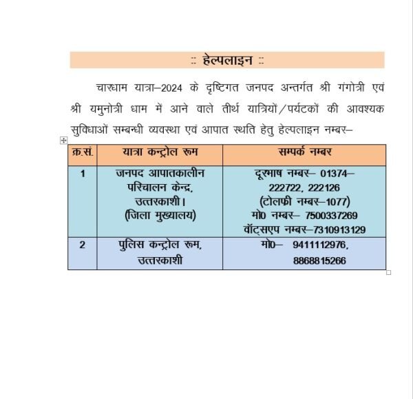 उत्तरकाशी। चारधाम में प्रसिद्ध यमुनोत्री और गंगोत्री धाम आने वाले तीर्थयात्रियों की मदद को प्रशासन ने हेल्पलाइन नम्बर जारी कर दिए हैं। आपदा और पुलिस के हेल्पलाइन नम्बरों पर 24 घण्टे दोनों धामों से जुड़ी महत्वपूर्ण जानकारी दी जाएगी। कंट्रोल रूम की मॉनिटरिंग भी शीर्ष अफसरों को दी गई है। ताकि तीर्थयात्रियों की हर समस्या का त्वरित निदान हो सके।