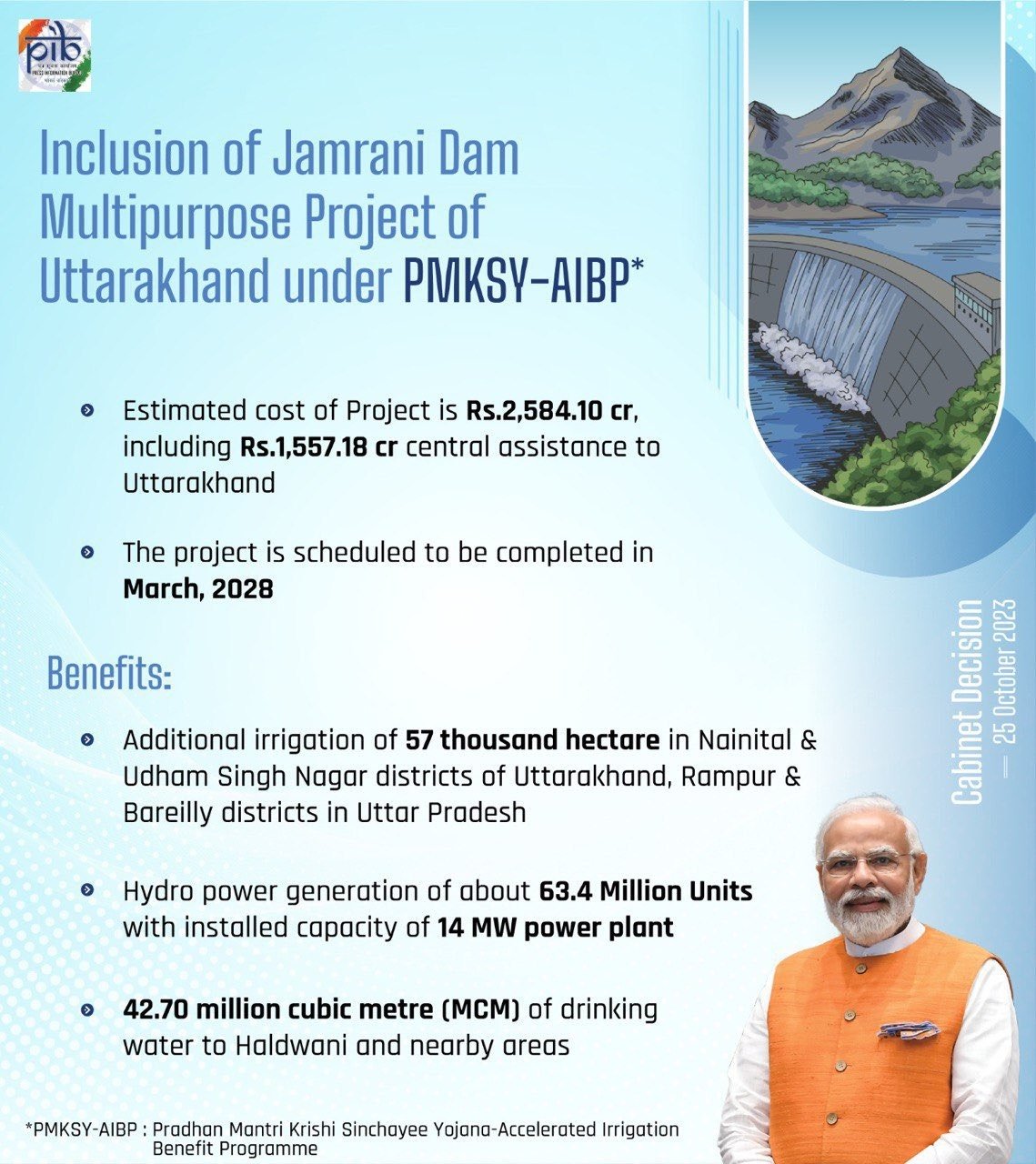 विदित हो कि प्रधानमंत्री कृषि सिंचाई योजना (वृहद एवं मध्यम ) के अन्तर्गत जमरानी बांध परियोजना के वित्त पोषण हेतु निवेश स्वीकृति एवं जल शक्ति मंत्रालय की स्क्रीनिंग कमेटी द्वारा स्वीकृति प्रदान की गई थी। उक्त स्वीकृतियों के उपरान्त पब्लिक इन्वेस्टमेंट बोर्ड, वित्त मंत्रालय भारत सरकार को वित्तीय स्वीकृति हेतु जल शक्ति मंत्रालय द्वारा प्रस्ताव प्रेषित किया गया था। प्रस्ताव पर वित्त मंत्रालय द्वारा इसी वर्ष मार्च माह में आयोजित पी०आई०बी० की बैठक में सहमति व्यक्त की गई।