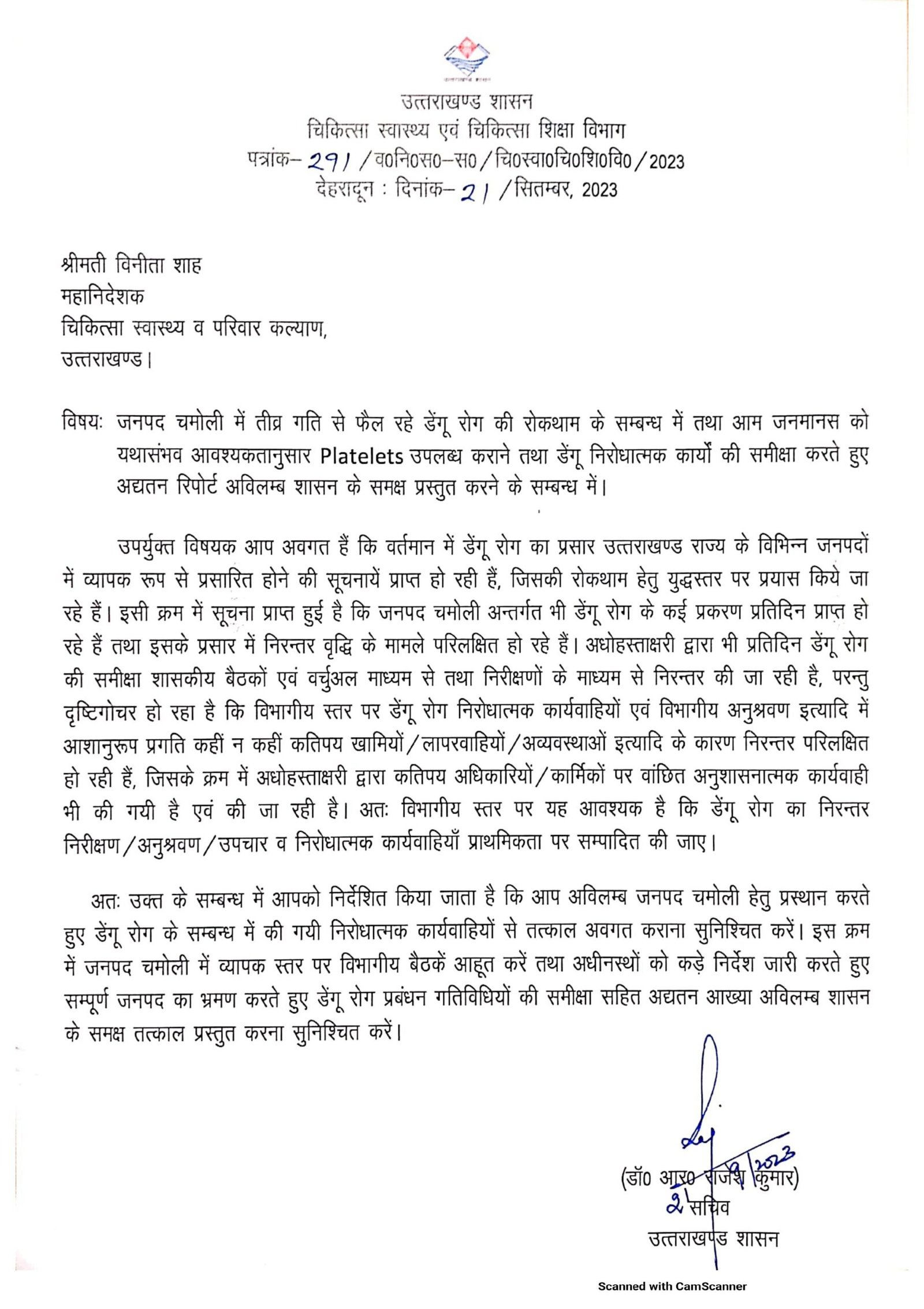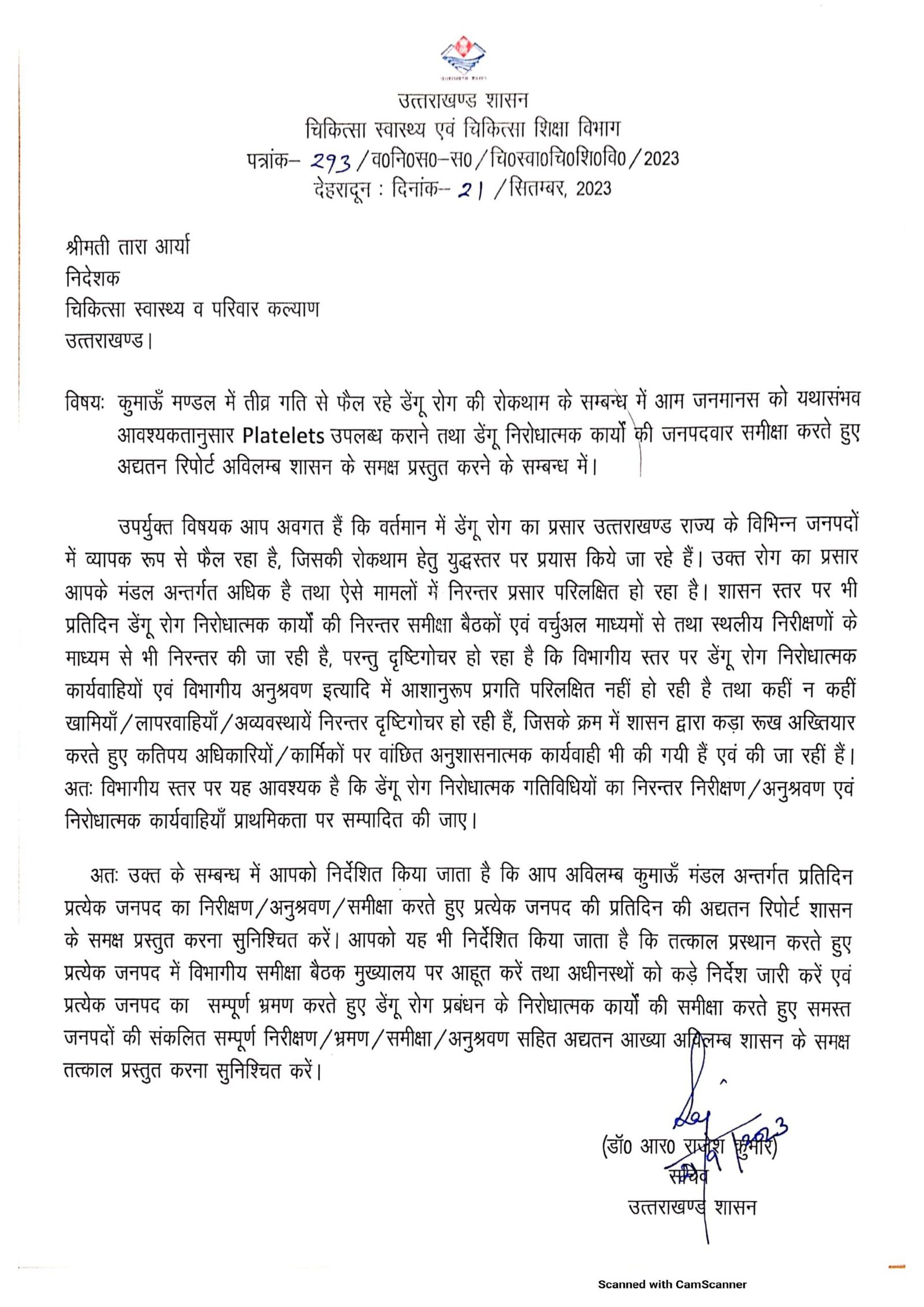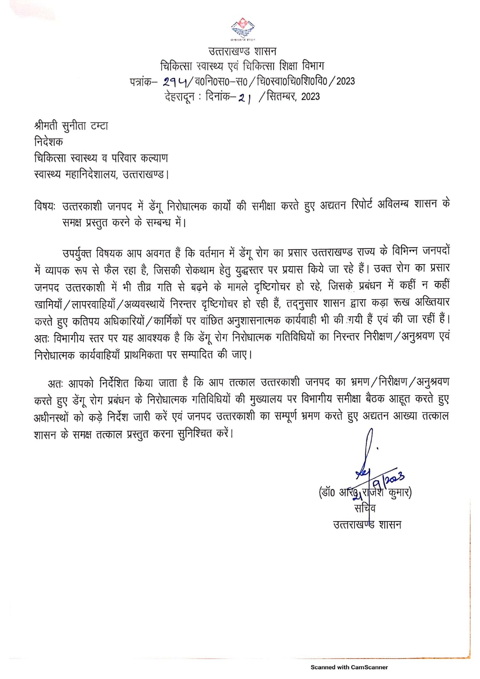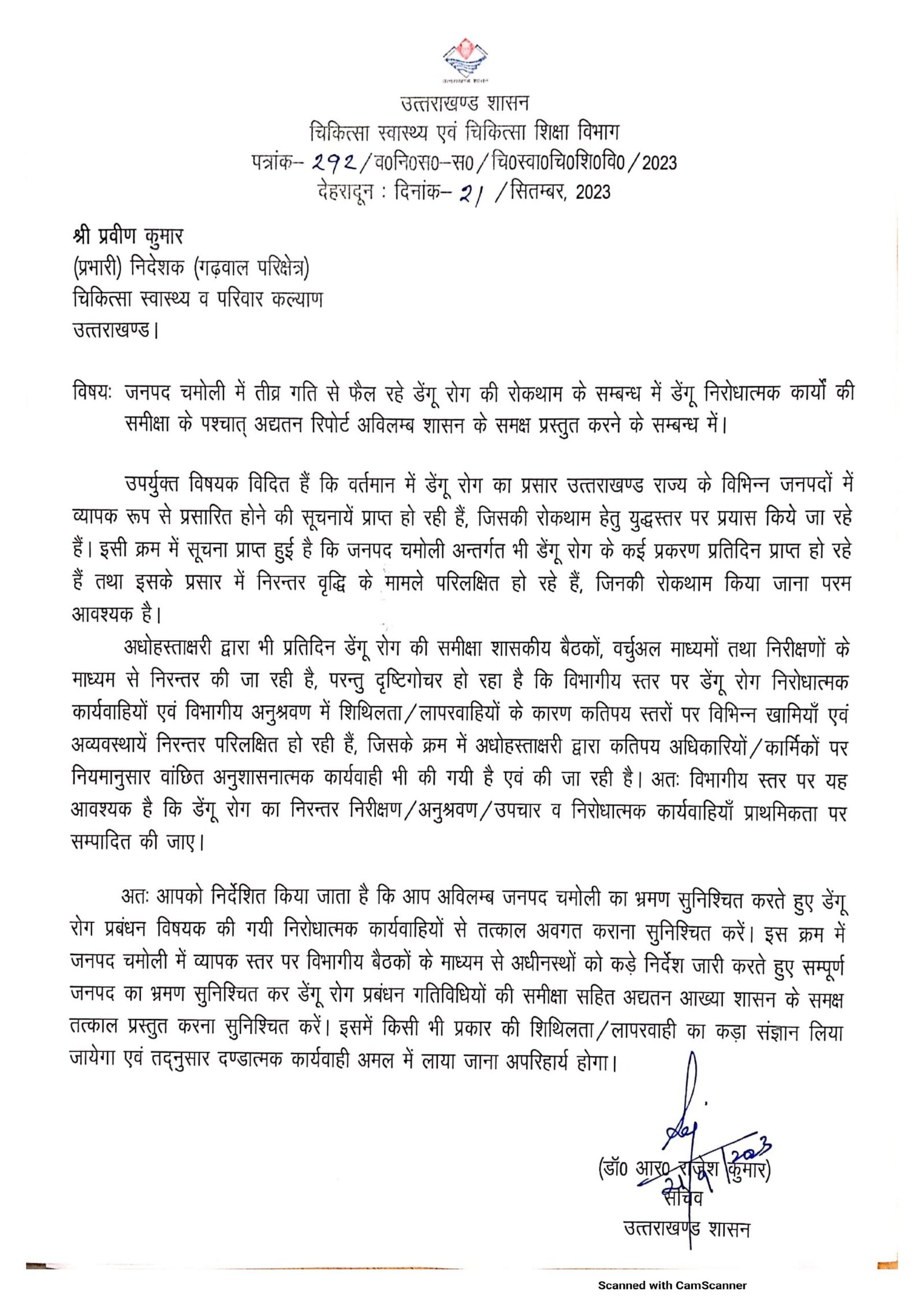 उपर्युक्त विषयक आप अवगत हैं कि वर्तमान में डेंगू रोग का प्रसार उत्तराखण्ड राज्य के विभिन्न जनपदों में व्यापक रूप से फैल रहा है, जिसकी रोकथाम हेतु युद्धस्तर पर प्रयास किये जा रहे हैं। उक्त रोग का प्रसार आपके मंडल अन्तर्गत अधिक है तथा ऐसे मामलों में निरन्तर प्रसार परिलक्षित हो रहा है। शासन स्तर पर भी प्रतिदिन डेंगू रोग निरोधात्मक कार्यों की निरन्तर समीक्षा बैठकों एवं वर्चुअल माध्यमों से तथा स्थलीय निरीक्षणों के माध्यम से भी निरन्तर की जा रही है, परन्तु दृष्टिगोचर हो रहा है कि विभागीय स्तर पर डेंगू रोग निरोधात्मक कार्यवाहियों एवं विभागीय अनुश्रवण इत्यादि में आशानुरूप प्रगति परिलक्षित नहीं हो रही है तथा कहीं न कहीं खामियाँ / लापरवाहियाँ / अव्यवस्थायें निरन्तर दृष्टिगोचर हो रही हैं, जिसके क्रम में शासन द्वारा कड़ा रूख अख्तियार करते हुए कतिपय अधिकारियों / कार्मिकों पर वांछित अनुशासनात्मक कार्यवाही भी की गयी हैं एवं की जा रहीं हैं। अतः विभागीय स्तर पर यह आवश्यक है कि डेंगू रोग निरोधात्मक गतिविधियों का निरन्तर निरीक्षण / अनुश्रवण एवं निरोधात्मक कार्यवाहियाँ प्राथमिकता पर सम्पादित की जाए।
