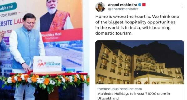 उत्तराखंड सरकार की ओर से आगामी दिसंबर माह में इन्वेस्टर समिट का आयोजन प्रस्तावित है। इसके लिए उत्तराखंड सरकार ने ढाई लाख करोड़ के निवेश का लक्ष्य रखा है। बीते दिनों दिल्ली में हुए समिट के कर्टेन रेजर कार्यक्रम में देश के कई नामी उद्योग घरानों ने राज्य में निवेश की दिशा में कदम बढ़ाते हुए एमओयू पर हस्ताक्षर किये। हॉस्पिटैलिटी के क्षेत्र में अग्रणी महिंद्रा ग्रुप के द्वारा भी उत्तराखंड में 1000 करोड़ के निवेश के एमओयू किये गए। अब, महिंद्रा ग्रुप के चेयरमैन श्री आनंद महिंद्रा ने इसे लेकर एक्स पर अपनी राय साझा की है। उन्होंने लिखा  दुनिया में भारत मे पर्यटन के क्षेत्र में अपार संभावनाएं हैं।