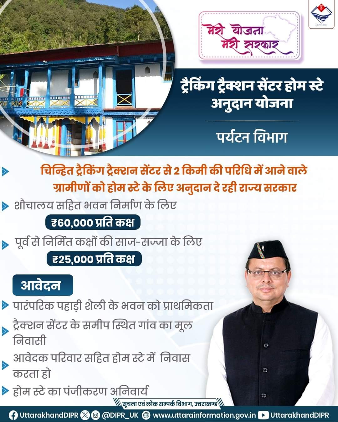 देहरादून :  अपने लुभावने परिदृश्यों और समृद्ध सांस्कृतिक विरासत के लिए प्रसिद्ध उत्तराखंड भारत में पर्यटन के लिए एक महत्वपूर्ण गंतव्य के रूप में उभरा है। मुख्यमंत्री पुष्कर सिंह धामी के नेतृत्व में, पर्यटन के बुनियादी ढांचे को बढ़ाने और स्थानीय जुड़ाव को बढ़ावा देने के लिए विभिन्न पहलों को लागू किया गया है, जिससे क्षेत्र में सतत विकास सुनिश्चित हो सके। ऐसी ही एक पहल है “ट्रैकिंग ट्रैक्शन सेंटर होम स्टे अनुदान योजना”, पर्यटन में सामुदायिक भागीदारी को बढ़ावा देने के उद्देश्य से महत्वपूर्ण योजना है।