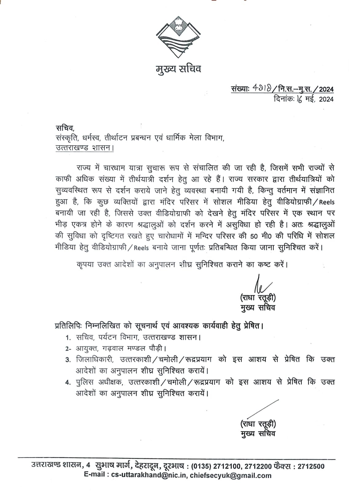 देहरादून। उत्तराखंड में 10 में से शुरू हुई चारधाम यात्रा अपने चरम पर है। ऐसे में बीते एक सप्ताह में बड़ी संख्या में श्रद्धालुओं का सैलाब उमड़ता हुआ दिखाई दे रहा है। एक तरफ सरकार यात्रा को सरल, सुगम और बेहतर बनाने के लिए हर संभव प्रयास कर रही है, तो दूसरी और मंदिर परिसर में कुछ व्यक्तियों द्वारा सोशल मीडिया के लिए वीडियोग्राफी जैसे रील्स बनायी जा रही है, जिससे वीडियोग्राफी को देखने के लिए मंदिर परिसर में एक स्थान पर भीड़ एकत्र होने के कारण श्रद्धालुओं को दर्शन करने में असुविधा हो रही है। ऐसे में श्रद्धालुओं की सुविधा को दृष्टिगत रखते हुए चारो धामों में मन्दिर परिसर की 50 मीटर की परिधि में सोशल मीडिया के लिए रिल्स बनाये जाना पूर्ण रूप से प्रतिबन्धित किया गया है।