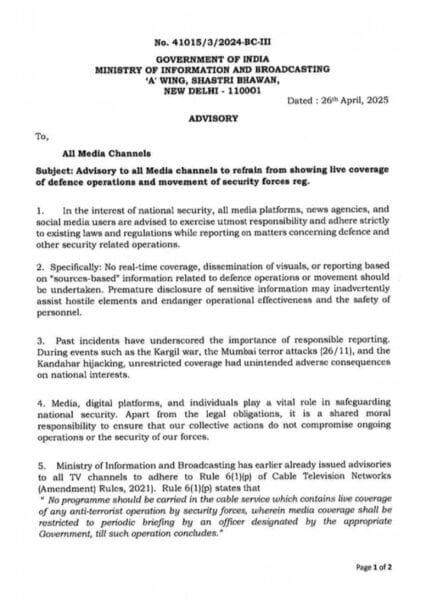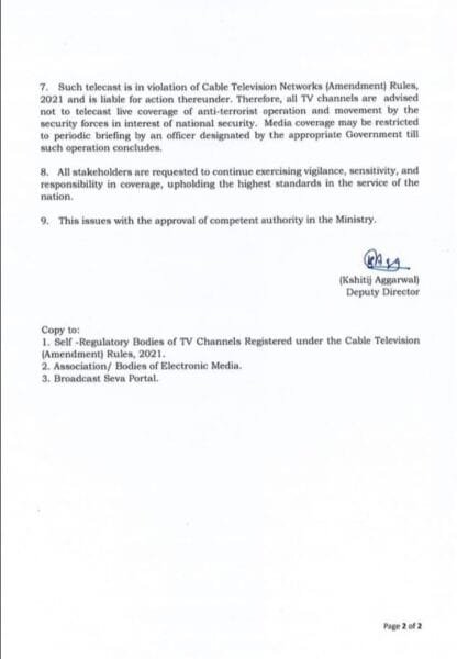 “कोई भी ऐसा कार्यक्रम केबल सेवा में प्रसारित नहीं किया जाएगा जिसमें किसी आतंक-रोधी अभियान या सुरक्षा बलों की कार्रवाई की लाइव कवरेज हो। ऐसी स्थितियों में मीडिया कवरेज को केवल सरकार द्वारा नामित अधिकारी की नियमित ब्रीफिंग तक सीमित रखा जाएगा।” स्पष्ट है कि यदि कोई चैनल इस निर्देश का उल्लंघन करता है, तो उसके खिलाफ कानूनी कार्रवाई की जा सकती है।