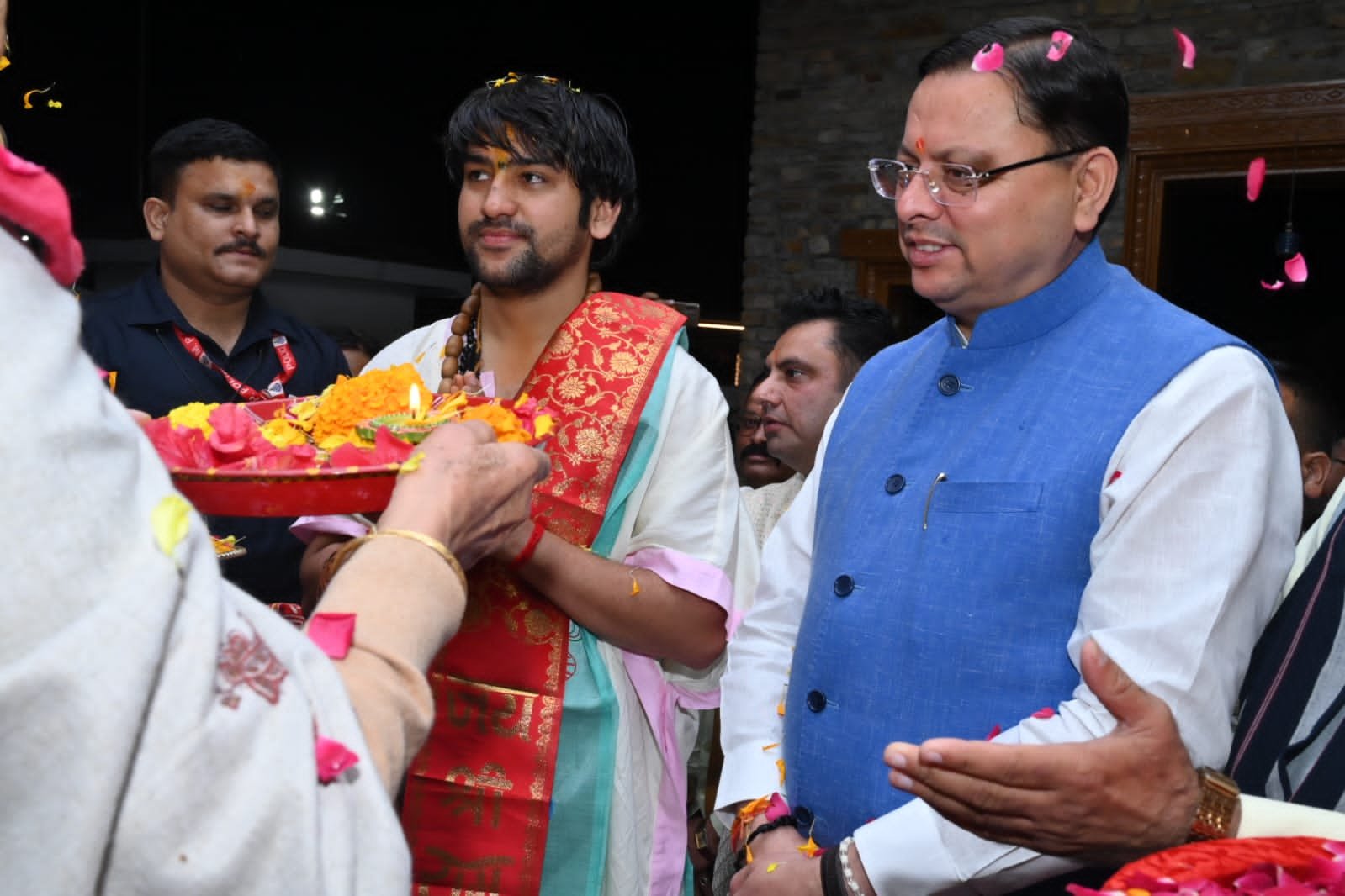 देहरादून : मुख्यमंत्री पुष्कर सिंह धामी ने शनिवार को परेड ग्राउण्ड में आयोजित कार्यक्रम बागेश्वर धाम के पीठाधीश्वर धीरेन्द्र शास्त्री के कार्यक्रम में शामिल हुये। उन्होंने पं0 धीरेन्द्र शास्त्री से आशीर्वाद प्राप्त कर उन्हे सनातन संस्कृति का संरक्षक बताया। वे हमारी सनातन संस्कृति के संरक्षक के रूप में भारत की सही पहचान को भावी पीढी तक पहुंचाने का दायित्व निर्वहन कर रहे है।