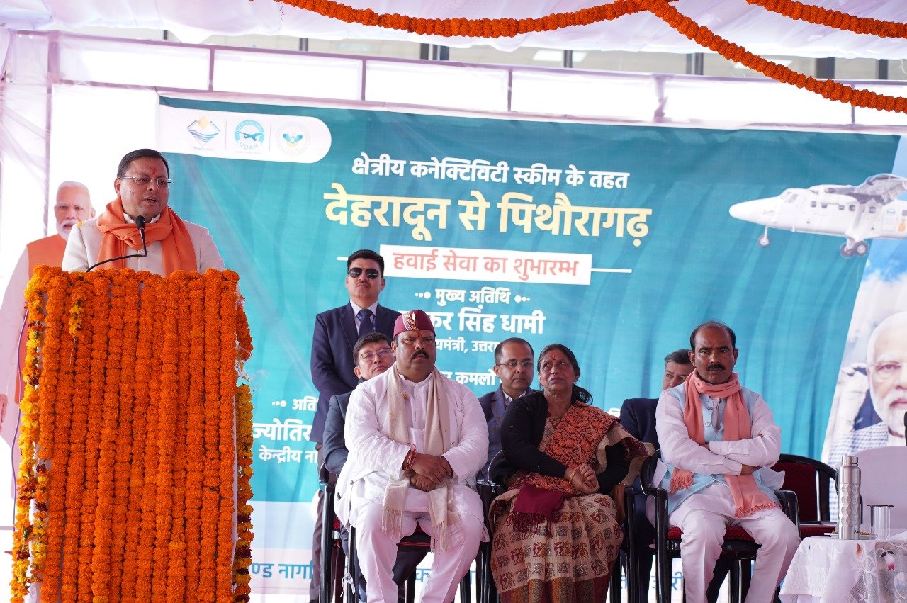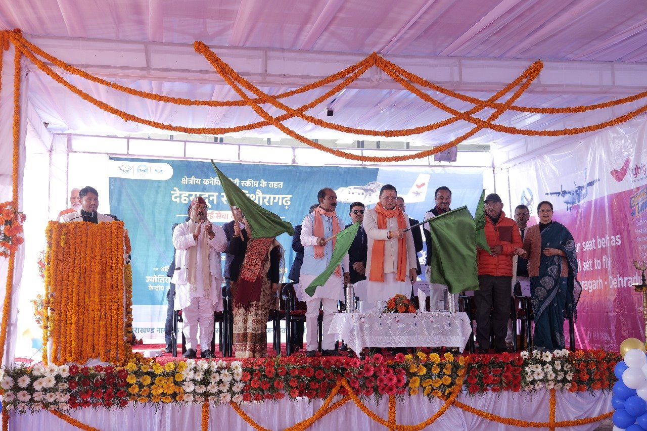 देहरादून : मुख्यमंत्री पुष्कर सिंह धामी ने मंगलवार को नैनी सैनी एयरपोर्ट से पिथौरागढ़-देहरादून हवाई सेवा का शुभारंभ किया व स्वयं भी हवाई जहाज में बैठकर देहरादून रवाना हुए। मुख्यमंत्री ने इस हवाई सेवा प्रारंभ होने पर सभी को बधाई दी उन्होंने प्रधानमंत्री नरेंद्र मोदी व नागरिक उड्डयन मंत्री श्री ज्योतिरादित्य सिंधिया का आभार भी व्यक्त किया। उन्होंने कहा उत्तराखंड धार्मिक पर्यटन की दृष्टि से अति महत्वपूर्ण राज्य है। यहां पर धार्मिक पर्यटन व प्राकृतिक पर्यटकों का आना-जाना सहजता से हो, इसके लिए हवाई सेवा अति आवश्यक है। पहले पिथौरागढ़ से देहरादून, दिल्ली जाने में 17 घंटे लगते थे। मोदी जी के प्रयास से ऑल वेदर सड़क बनने से देहरादून, दिल्ली 11 घंटे लगते हैं, सीमांत जिले में हवाई सेवा प्रारंभ होने के बाद 1 घंटे में देहरादून पहुंच सकते हैं।