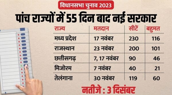 पांचों राज्यों में कुल 679 विधानसभा सीटें हैं। मध्य प्रदेश में इस वक्त भाजपा की सरकार है। वहीं, छत्तीसगढ़ और राजस्थान में कांग्रेस शासन में है। तेलंगाना में के. चंद्रशेखर राव वाली भारत राष्ट्र समिति यानी बीआरएस की सरकार है। मिजोरम में जोरमथंगा की मिजो नेशनल फ्रंट सत्ताधारी पार्टी है।