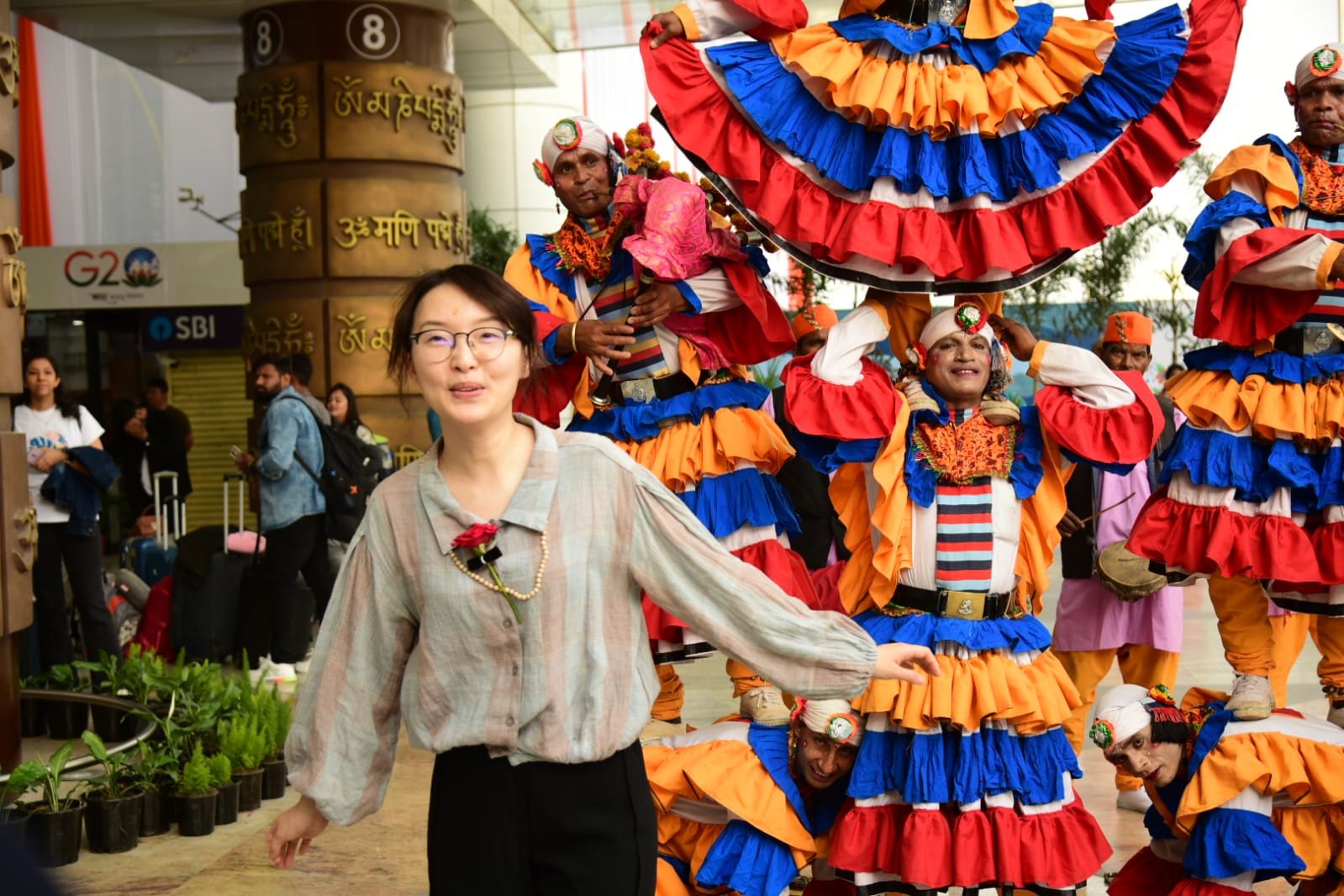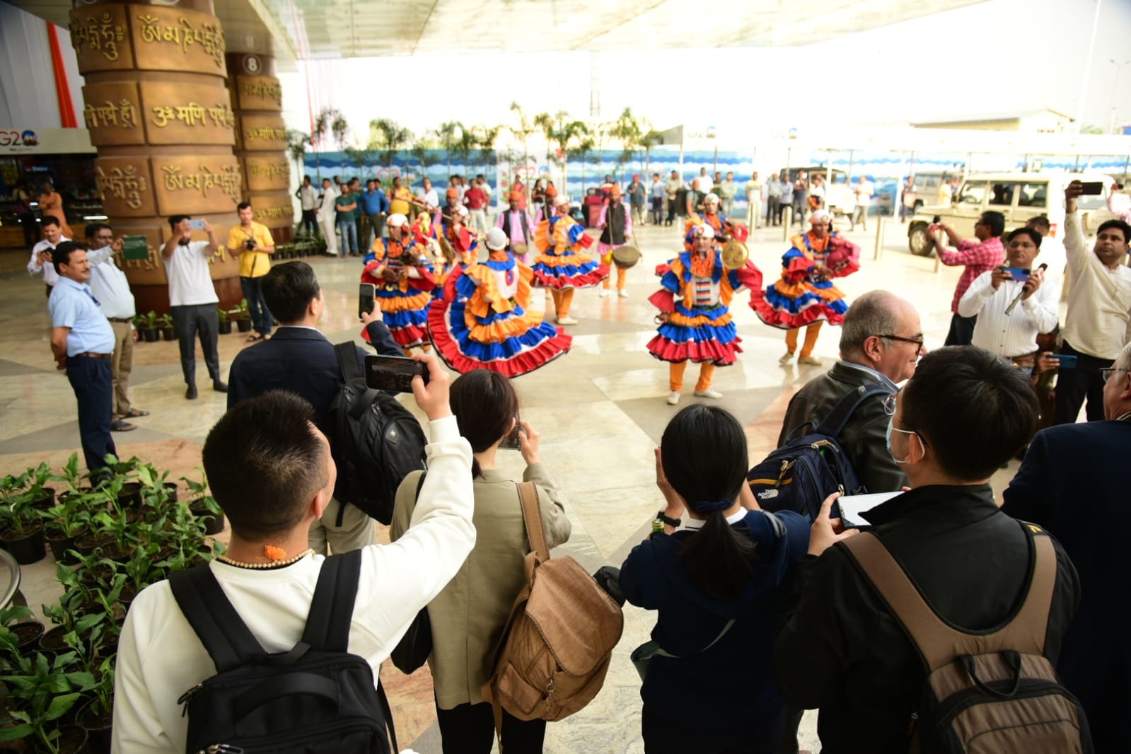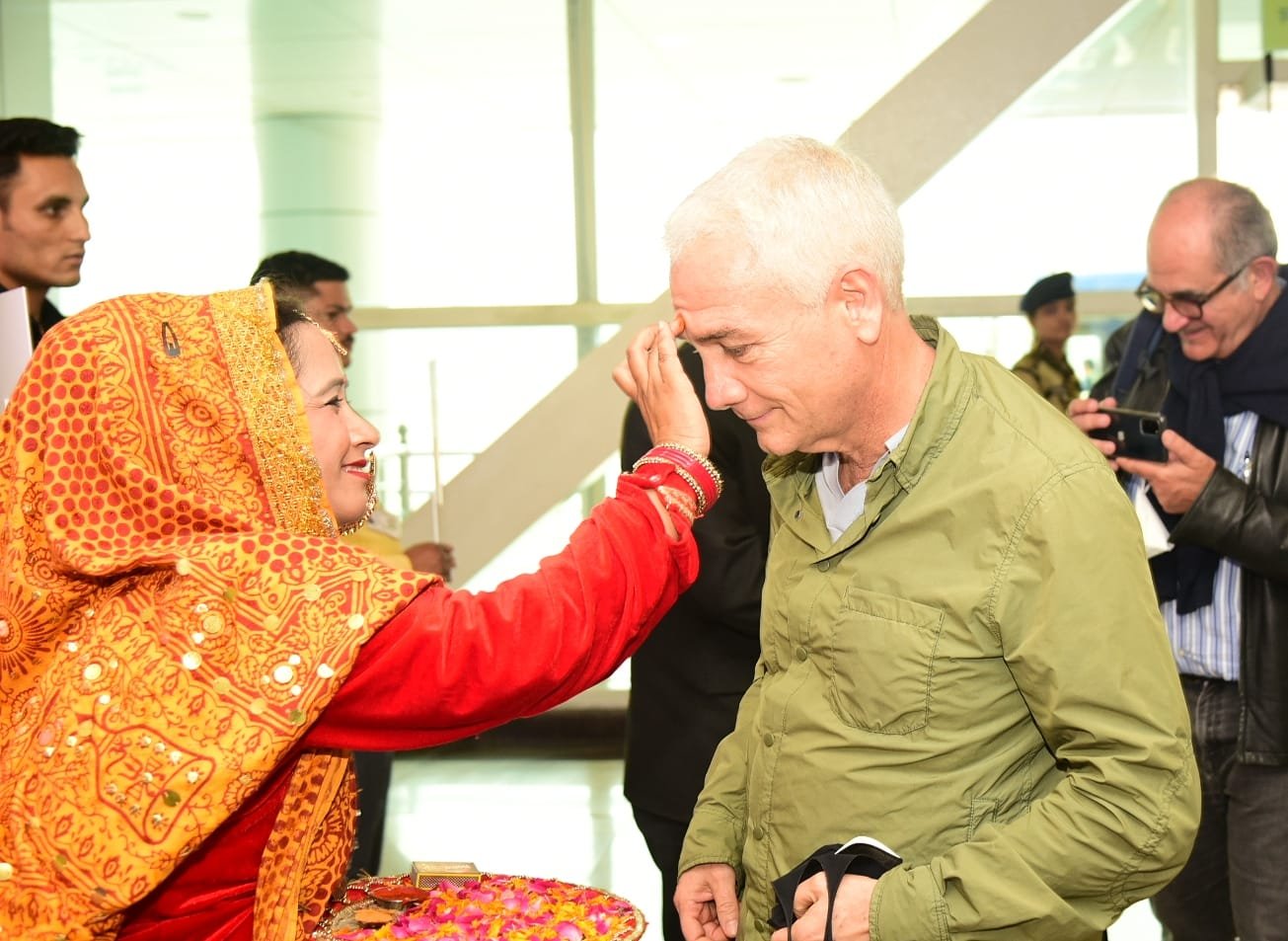 देहरादून। नरेंद्रनगर में 25 से 27 मई को होने जा रही जी-20 बैठक के लिए विदेशी मेहमानों के पहुँचने का सिलसिला शुरू हो गया है। आज सुबह विदेशी डेलिगेट्स का एक ग्रुप जॉलीग्रांट एयरपोर्ट पर पहुँचा जहां उनका पारंपरिक रूप से तिलक व माला पहनाकर स्वागत किया गया। इस दौरान छोलिया नृत्य की पारंपरिक वाद्य यंत्रों पर प्रस्तुति दी रहे कलाकारों को देखकर डेलिगेट्स खुद को नहीं रोक पाए और महिलाओं के साथ ही पुरुष डेलिगेट्स ने भी उत्तराखंड के गीत-संगीत पर कलाकारों संग सुंदर नृत्य किया। सभी मेहमान एयरपोर्ट पर हुई मेहमाननवाजी से काफी खुश एवं अभिभूत नजर आए। इसके बाद इन सभी को नरेंद्रनगर में जहां जी-20 के मुख्य आयोजन हैं वहां ले जाया गया।