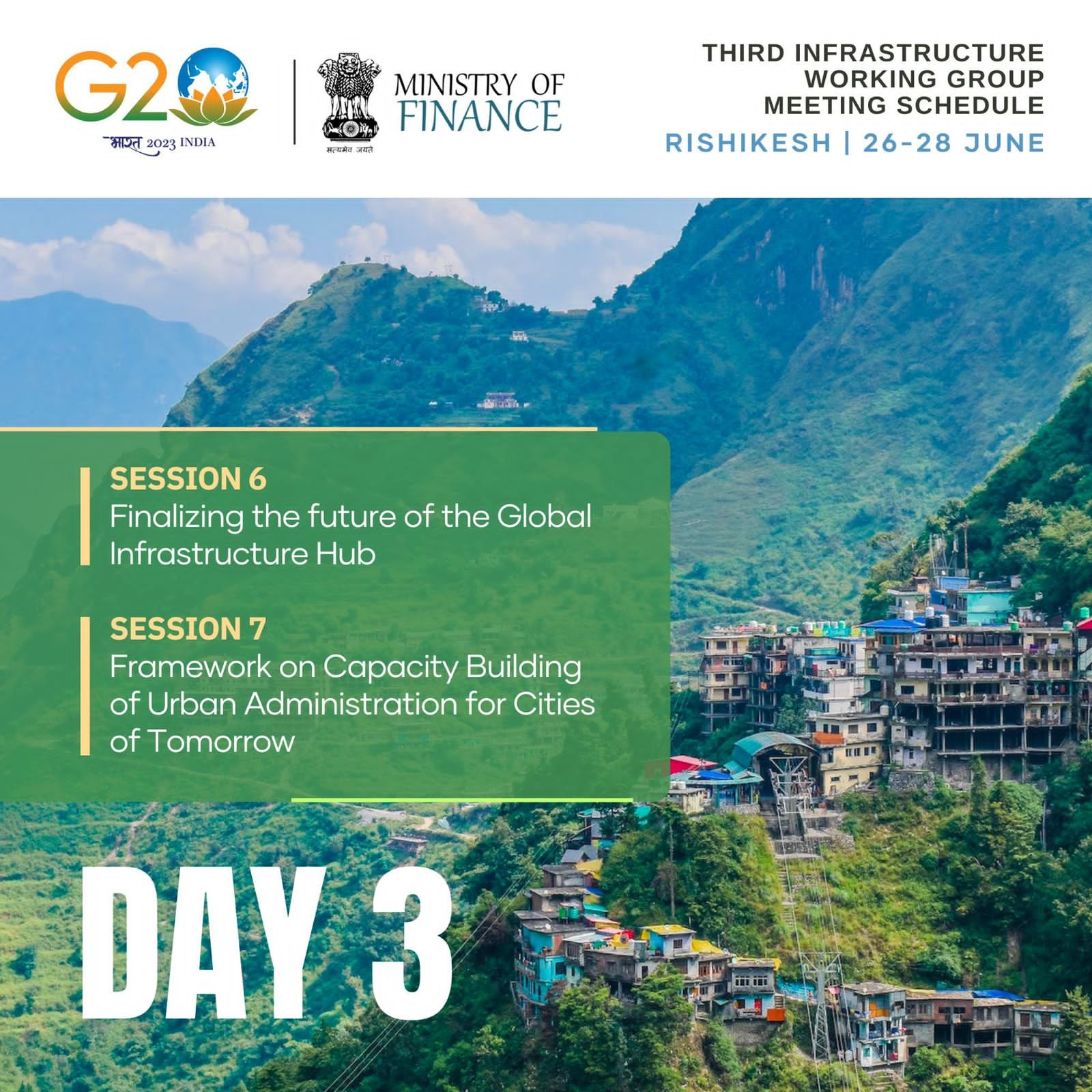 ऋषिकेश : भारतीय G20 प्रेसीडेंसी के तहत तीसरी G20 इंफ्रास्ट्रक्चर वर्किंग ग्रुप (IWG) की बैठक 28 जून 2023 को ऋषिकेश, उत्तराखंड में सफलतापूर्वक संपन्न हुई। तीन दिवसीय IWG बैठक 26 जून 2023 को शुरू हुई और इसमें G20 सदस्य देशों, आमंत्रित देशों और अंतर्राष्ट्रीय संगठनों के लगभग 63 प्रतिनिधियों ने भाग लिया। 28 जून 2023 को, बैठक के आखिरी में, दो सत्र आयोजित किए गए, जिसमें प्रतिनिधियों ने शहरी प्रशासन की क्षमताओं को बढ़ाने के ढांचे के साथ-साथ 2023 इंफ्रास्ट्रक्चर एजेंडा में उल्लिखित एक और महत्वपूर्ण कार्यधारा पर चर्चा की। कुल मिलाकर, तीसरी IWG बैठक में सभी सत्रों में सार्थक चर्चा हुई, जिसमें प्रेसीडेंसी ने स्पष्ट रूप से परिभाषित परिणामों की रूपरेखा तैयार की।