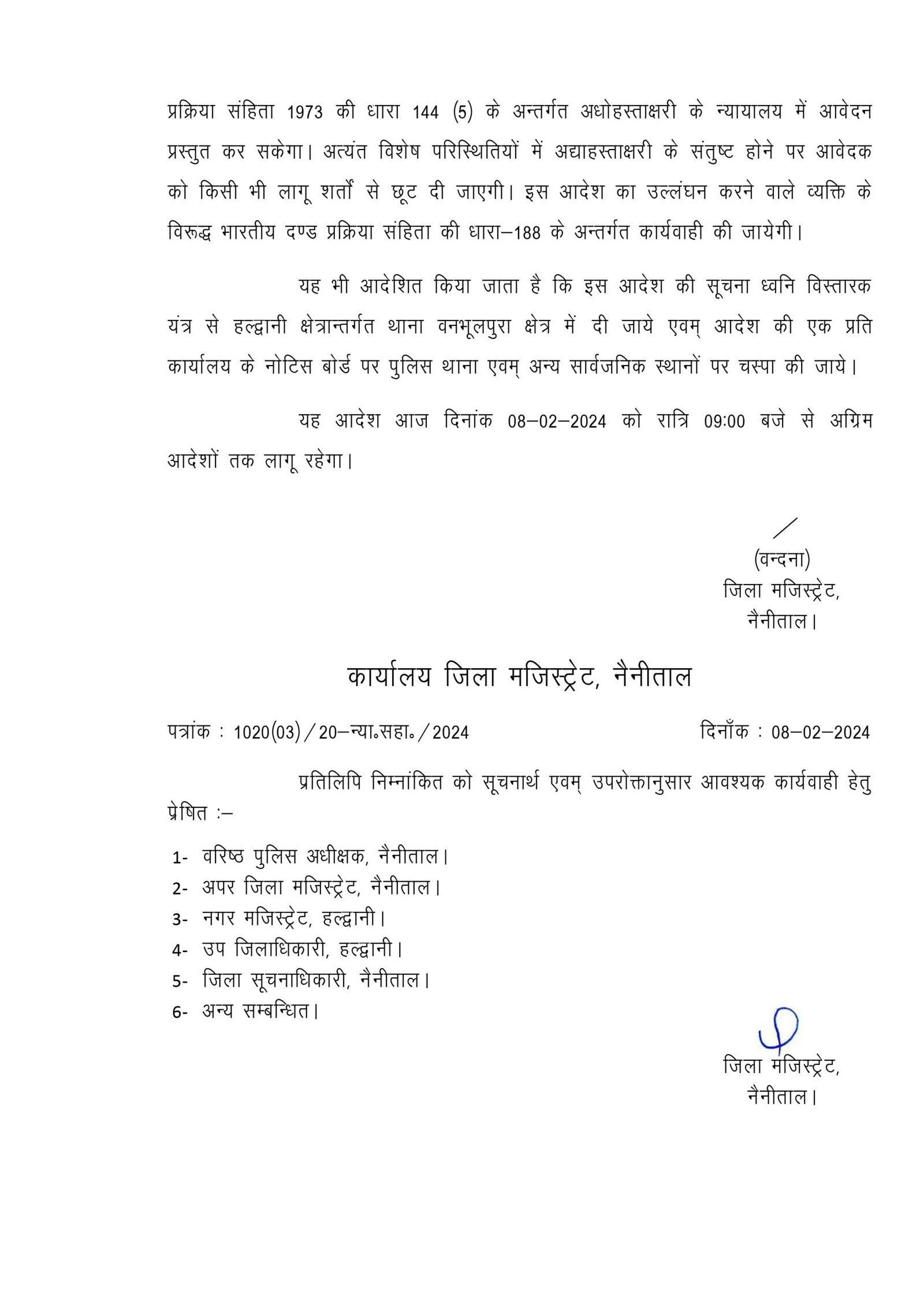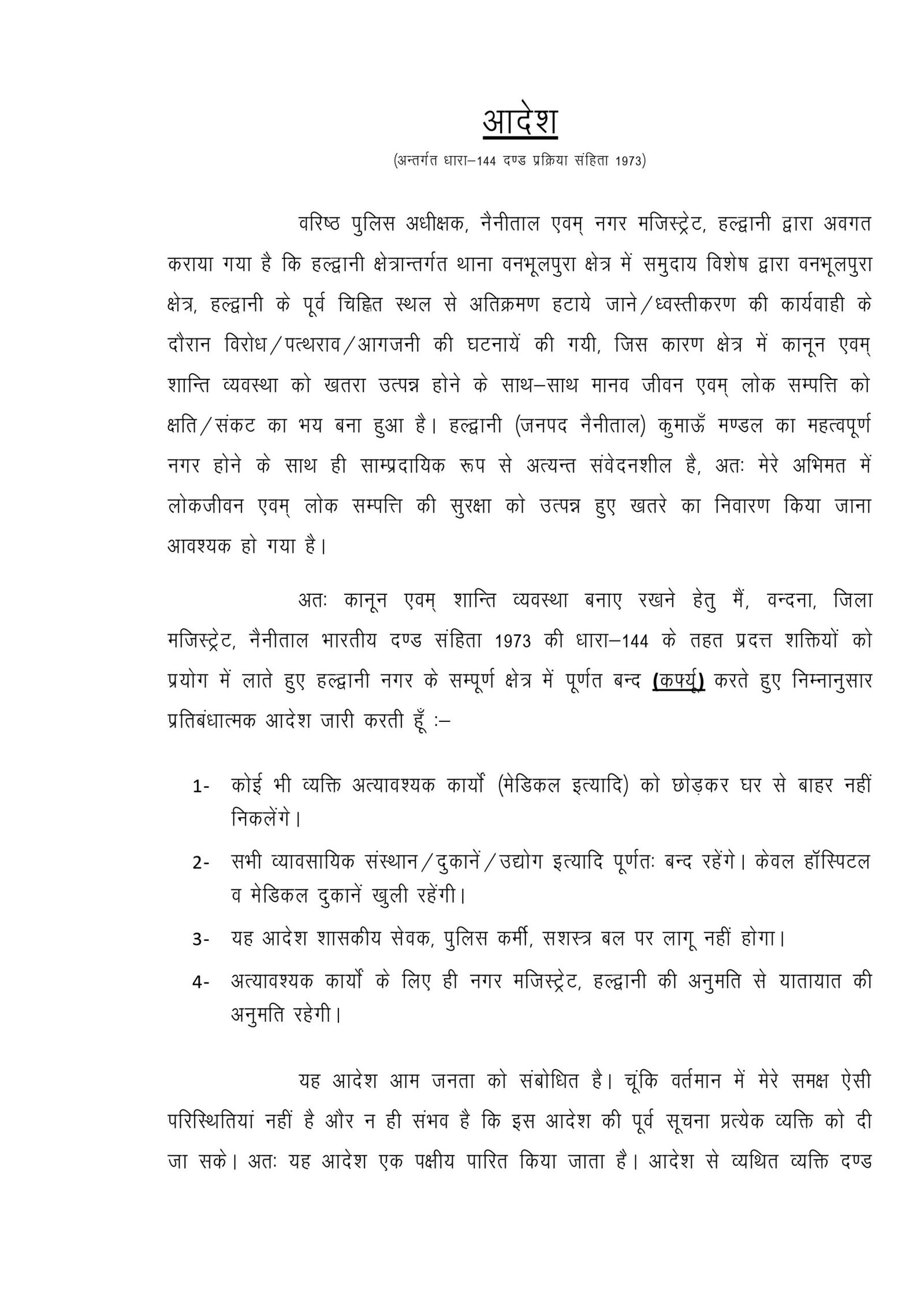 मुख्यमंत्री ने इस संबंध में गुरूवार को सांय मुख्यमंत्री आवास में मुख्य सचिव राधा रतूडी, पुलिस महानिदेशक अभिनव कुमार तथा अन्य उच्चाधिकारियों के साथ स्थिति की समीक्षा की। मुख्यमंत्री ने स्थानीय लोगों से शान्ति बनाये रखने की अपील करते हुए अराजक तत्वों के विरूद्ध सख्त कार्यवाही के निर्देश दिये है। मुख्यमंत्री ने कहा कि इस घटना के दोषियों के विरूद्ध सख्त कार्यवाही कर क्षेत्र में शान्ति व्यवस्था सुनिश्चित की जाए। उन्होंने स्पष्ट निर्देश दिये कि प्रदेश में किसी को भी कानून व्यवस्था से खिलवाड करने की छूट नहीं दी जानी चाहिए। प्रशासनिक अधिकारी निरंतर क्षेत्र में कानून व्यवस्था बनाये रखने के लिये प्रयासरत रहे। जिलाधिकारी द्वारा दूरभाष पर मुख्यमंत्री को अवगत कराया गया कि अशान्ति वाले क्षेत्र बनभूलपुरा में कर्फ्यू लगाया गया है तथा स्थिति को सामान्य बनाये रखने के लिये दंगाइयों को देखते ही गोली मारने के आदेश दिये गये है।