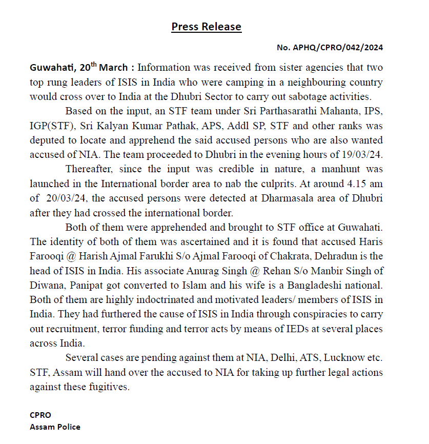 गुवाहाटी : सहायक एजेंसियों से जानकारी मिली थी कि भारत में आईएसआईएस के दो शीर्ष नेता जो पड़ोसी देश में डेरा डाले हुए थे, तोड़फोड़ की गतिविधियों को अंजाम देने के लिए धुबरी सेक्टर में भारत में प्रवेश करेंगे। इनपुट के आधार पर, श्री पार्थसारथी महंत, आईपीएस, आईजीपी (एसटीएफ), श्री कल्याण कुमार पाठक, एपीएस, अतिरिक्त एसपी, एसटीएफ और अन्य रैंकों के तहत एक एसटीएफ टीम को उक्त आरोपी व्यक्तियों का पता लगाने और पकड़ने के लिए नियुक्त किया गया था, जो वांछित आरोपी भी हैं। एनआईए. टीम 19/03/24 की शाम को धुबरी के लिए रवाना हुई। इसके बाद, चूंकि इनपुट विश्वसनीय था, इसलिए अपराधियों को पकड़ने के लिए अंतर्राष्ट्रीय सीमा क्षेत्र में एक तलाशी अभियान शुरू किया गया। 20/03/24 की सुबह लगभग 4.15 बजे, अंतरराष्ट्रीय सीमा पार करने के बाद धुबरी के धर्मशाला इलाके में आरोपी व्यक्तियों का पता चला।
