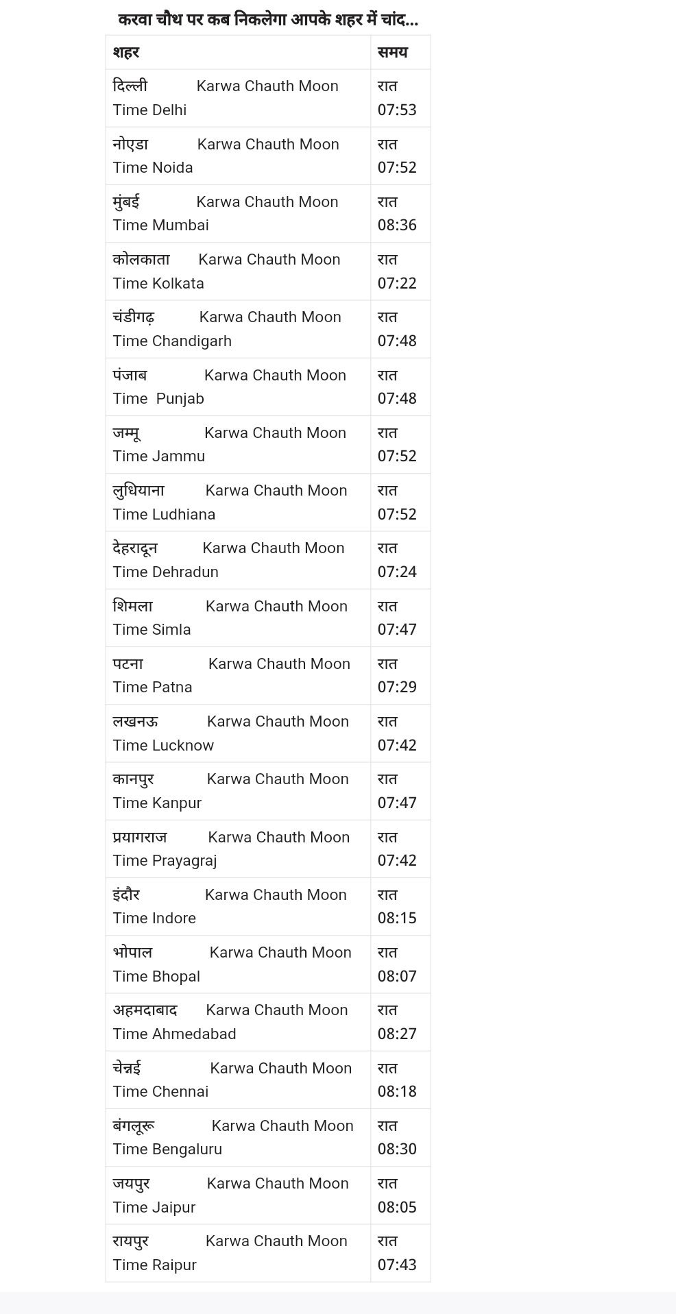 करवा चौथ पर चांद के दर्शन और पूजा का विशेष महत्व होता है। पंचांग के मुताबिक करवा चौथ पर चांद के निकलने का समय दिल्ली शहर को मानक मानते हुए शाम 07 बजकर 53 मिनट पर होगा। लेकिन अलग-अलग शहरों में चांद के निकलने के समय में कुछ बदलाव हो सकता है।