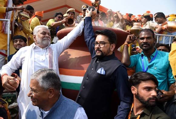 केंद्रीय मंत्री अनुराग सिंह ठाकुर अमृत कलश यात्रा के उत्सव में सम्मिलित हुए और मेरी माटी मेरा देश के अमृत कलश में मिट्टी समर्पित की। इस अवसर पर केन्द्रीय मंत्री अनुराग सिंह ठाकुर ने कहा कि पिछले दो वर्षों के दौरान देश ने आजादी का अमृत महोत्सव मनाया और इसके अंतर्गत आयोजित लाखों कार्यक्रमों में करोड़ों लोगों ने भाग लिया। उन्होंने कहा कि प्रधानमंत्री श्री नरेन्द्र मोदी ने “मेरी माटी मेरा देश” कार्यक्रम में जन-जन की भागीदारी का आह्वान किया और भारत के छह लाख गांवों में अमृत कलश यात्राएं आयोजित की गईं। श्री ठाकुर ने कहा कि इस दौरान देश के विभिन्न कोनों से मिट्टी एकत्र की गई। उन्होंने आगे कहा कि नई दिल्ली में कर्तव्यपथ पर आज उमड़ा जनसैलाब अपनी माटी और शहीदों को नमन करते हुए आजादी का अमृत महोत्सव मना रहा है। उन्होंने यह भी कहा कि देश का युवा एक भारत-श्रेष्ठ भारत की परिकल्पना को मजबूत कर रहा है। केंद्रीय मंत्री अनुराग सिंह ठाकुर ने कहा कि देश के युवा अपनी मिट्टी से जुड़े रहने और भारत को एक विकसित देश बनाने का संकल्प ले रहे हैं।