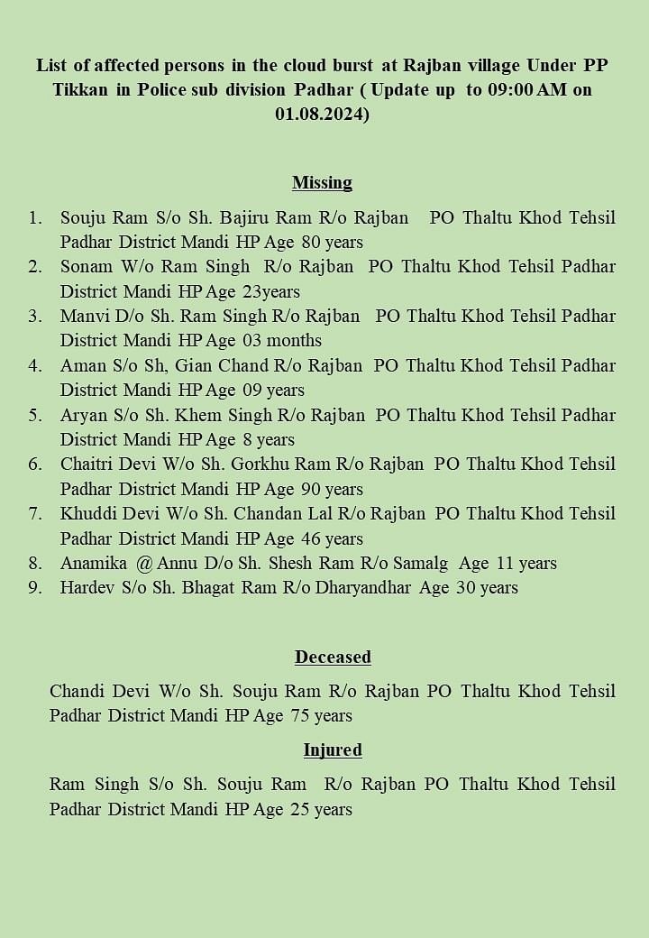 करीब 51 लोग अभी लापता हैं। 4 शव बरामद हुए हैं। मंडी जिले में 35 लोग सुरक्षित बचाए गए हैं। बादल फटने की घटना के बाद मंडी के पधर के सभी स्कूल और शिक्षण संस्थान आज बंद कर दिए गए हैं। DC ने आदेश जारी किए हैं। कुल्लू में भी सभी शिक्षण संस्थान 2 अगस्त के लिए बंद कर दिए गए हैं।