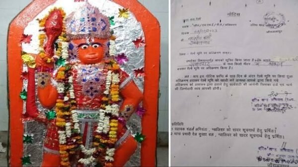 मध्यप्रदेश :  मुरैना में बजरंगबली को कानूनी नोटिस और खर्चा वसूली करने की चेतावनी दी गई ह।  रेल विभाग का अजीबो गरीब कारनामा सामने आया है। विभाग ने मंदिर में विराजमान भगवान बजरंगबली को नोटिस जारी किया है। हैरत की बात यह है कि रेलवे ने इस नोटिस में बजरंग बली को ही अतिक्रमणकारी बताते हुए सात दिन में अतिक्रमण हटाने को भी कहा है। साथ ही रेलवे की तरफ से यह भी चेतावनी दी गई है कि अतिक्रमण न हटाने पर रेलवे जबरन कार्रवाई करेगा और जेसीबी आदि के खर्च की वसूली बजरंगबली से होगी।