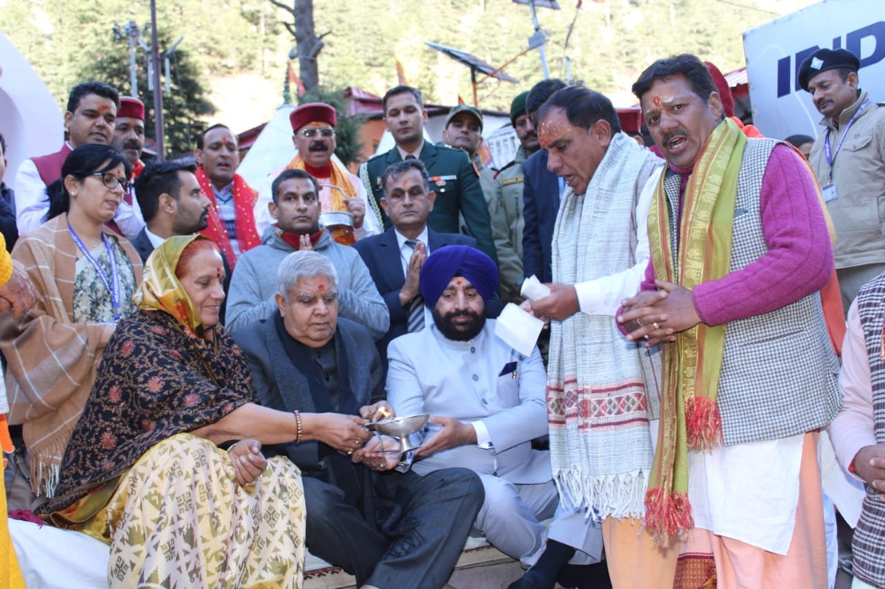 गंगोत्री धाम में श्री पांच गंगोत्री मंदिर समिति के अध्यक्ष रावल हरीश सेमवाल, सुरेश सेमवाल, महेश सेमवाल, संजीव सेमवाल, मुकेश, मनु, कमलनयन, माधव सेमवाल आदि तीर्थपुरोहितों ने वैदिक मंत्रोच्चार के साथ विधिवत पूजा संपन्न करवाई। उप राष्ट्रपति के आगमन पर जिलाधिकारी अभिषेक रुहेला एवं क्षेत्रीय विधायक सुरेश चौहान के द्वारा स्मृति चिन्ह, शॉल एवं स्थानीय उत्पाद तथा हर्षिल क्षेत्र का बहुप्रसिद्ध सेब भेंट किया गया।