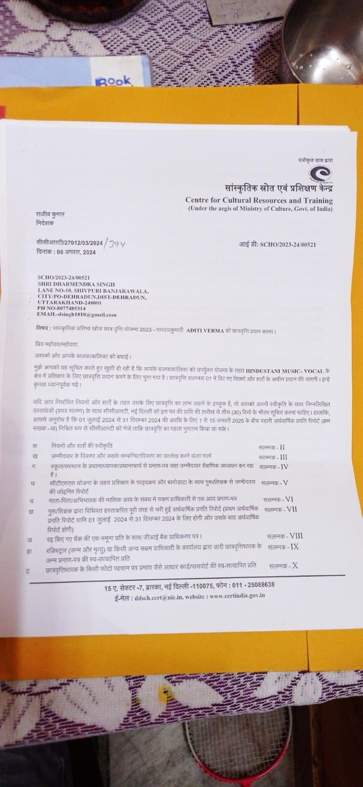 देहरादून : उत्तराखण्ड राज्य की कला एवं सांस्कृतिक क्षेत्र की गतिविधियों में एक स्वर्णिम अध्याय और जुड़ा है।हिन्दुस्तानी शास्त्रीय संगीत की विधिवत शिक्षा प्राप्त करते हुए उत्तराखण्ड की देहरादून निवासी 13 वर्षीय अदिति वर्मा का सी.सी.आर.टी, जूनियर वर्ग , सांस्कृतिक संसाधन एवं प्रशिक्षण केंद्र, संस्कृति मंत्रालय, भारत सरकार की छात्रवृति हेतु चयन हुआ है। वह हिन्दुस्तानी शास्त्रीय संगीत (गायन) में उत्तराखण्ड राज्य से चयनित होने वाली एकमात्र अकेली प्रतिभागी हैं।