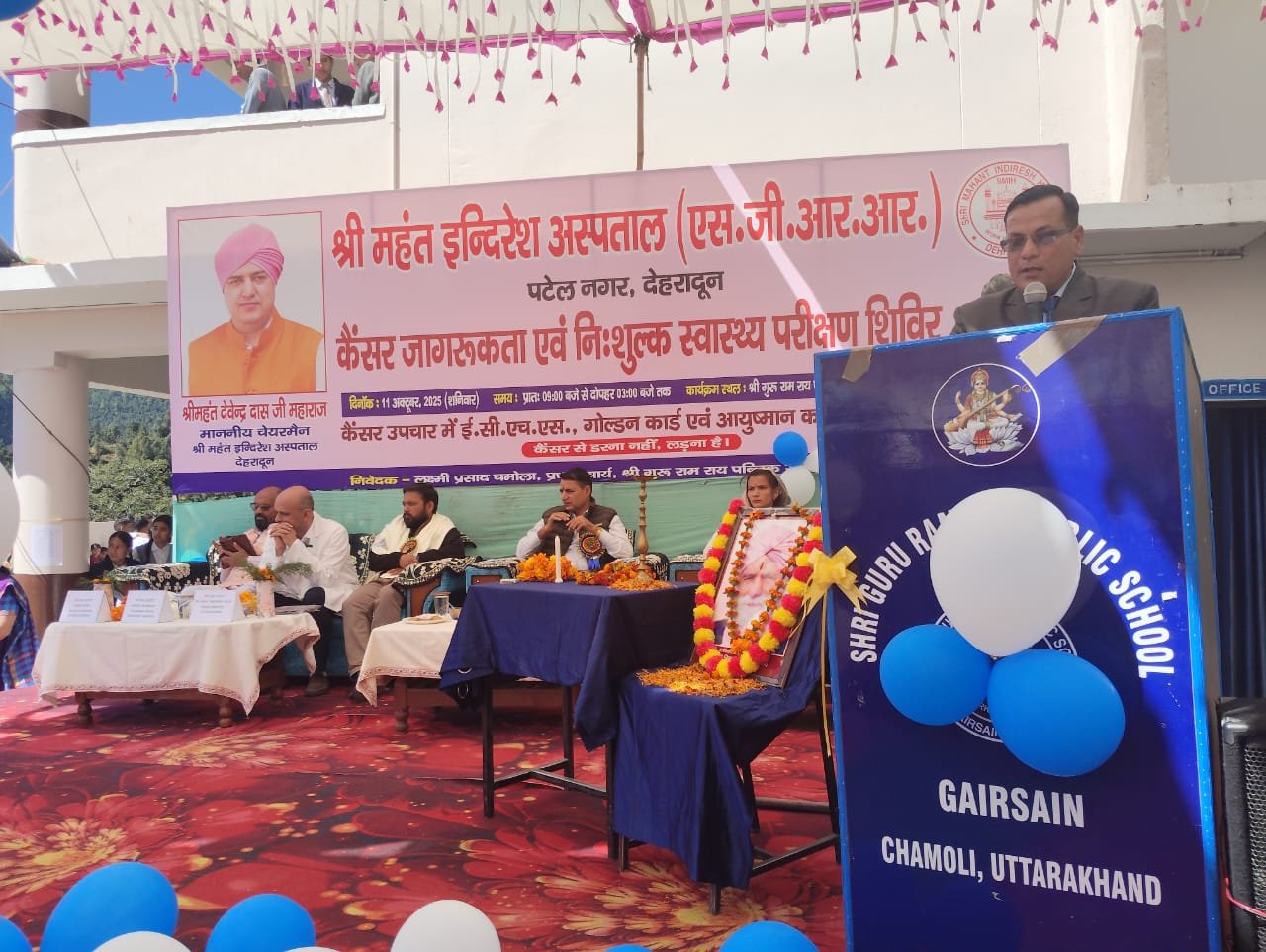देहरादून। श्री महंत इन्दिरेश अस्पताल, देहरादून के सौजन्य से श्री गुरु राम राय पब्लिक स्कूल, गैरसैंण में शनिवार, 11 अक्टूबर 2025 को कैंसर जागरूकता एवं निःशुल्क स्वास्थ्य परीक्षण शिविर का सफल आयोजन किया गया। इस अवसर पर 3002 से अधिक मरीजों ने शिविर का लाभ उठाया। शिविर में अस्पताल के विशेषज्ञ चिकित्सकों ने स्वास्थ्य परामर्श दिया तथा रोगियों को निःशुल्क दवाइयाँ वितरित की गईं।