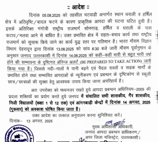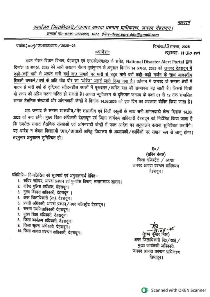 देहरादून : मौसम विभाग और नेशनल डिजास्टर अलर्ट पोर्टल की चेतावनी के बाद जिला प्रशासन ने देहरादून समेत पांच जिलों में 14 अगस्त को सभी स्कूलों और आंगनबाड़ी केंद्रों में अवकाश घोषित कर दिया है। यह आदेश सरकारी, गैर-सरकारी, निजी स्कूलों और सभी शिक्षण संस्थानों पर समान रूप से लागू होगा।