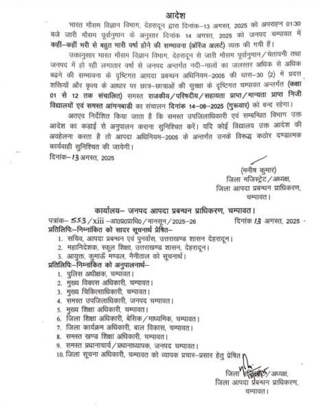 मौसम विभाग, देहरादून द्वारा जारी भारी वर्षा की संभावना के दृष्टिगत कल बृहस्पतिवार अर्थात 14 अगस्त को जनपद चंपावत में कक्षा 1 से 12 तक के समस्त स्कूलों के साथ साथ सभी आंगनबाड़ी केंद्रों में एक दिन का अवकाश घोषित किया गया है।