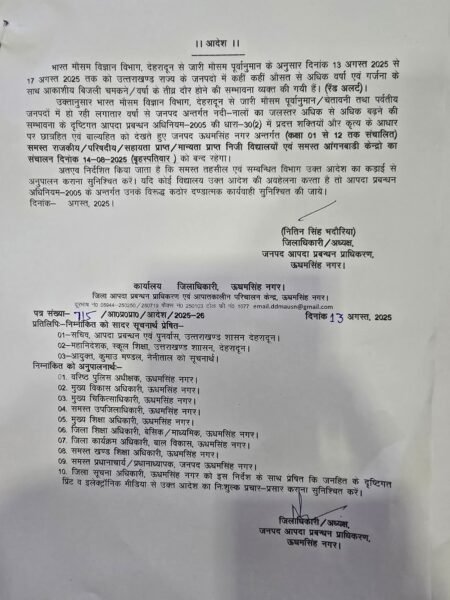 मौसम विभाग, देहरादून द्वारा जारी भारी वर्षा की संभावना के दृष्टिगत कल बृहस्पतिवार अर्थात 14 अगस्त को जनपद ऊधमसिंह नगर और उत्तरकाशी में कक्षा 1 से 12 तक के समस्त स्कूलों के साथ साथ सभी आंगनबाड़ी केंद्रों में एक दिन का अवकाश घोषित किया गया है।