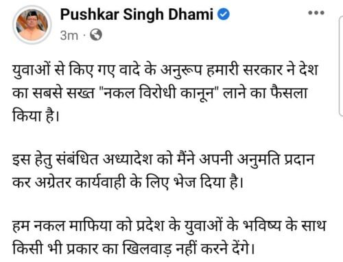 देहरादून : उत्तराखण्ड प्रदेश में प्रतियोगी परीक्षाओं में पारदर्शिता एवं शुचिता को सुनिश्चित करने के लिए राज्य सरकार द्वारा आज दिनांक 09 फरवरी, 2023 को उत्तराखण्ड प्रतियोगी परीक्षा (भर्ती में अनुचित साधनों की रोकथाम व निवारण के उपाय) अध्यादेश 2023 को मुख्यमंत्री पुष्कर सिंह धामी द्वारा अनुमोदन प्रदान किया गया। इस अध्यादेश में दोषियों के विरूद्ध सख्त प्रावधान किए गए हैं। यदि कोई व्यक्ति, प्रिटिंग प्रेस, सेवा प्रदाता संस्था, प्रबंध तंत्र, कोचिंग संस्थान इत्यादि अनुचित साधनों में लिप्त पाया जाता है तो उसके लिए आजीवन कारावास तक की सजा तथा दस करोड़ रूपए तक के जुर्माने का प्रावधान किया गया है। यदि कोई व्यक्ति संगठित रूप से परीक्षा कराने वाली संस्था के साथ षडयंत्र करता है तो आजीवन कारावास तक की सजा एवं 10 करोड़ रूपए तक के जुर्माने का प्रावधान किया गया है।