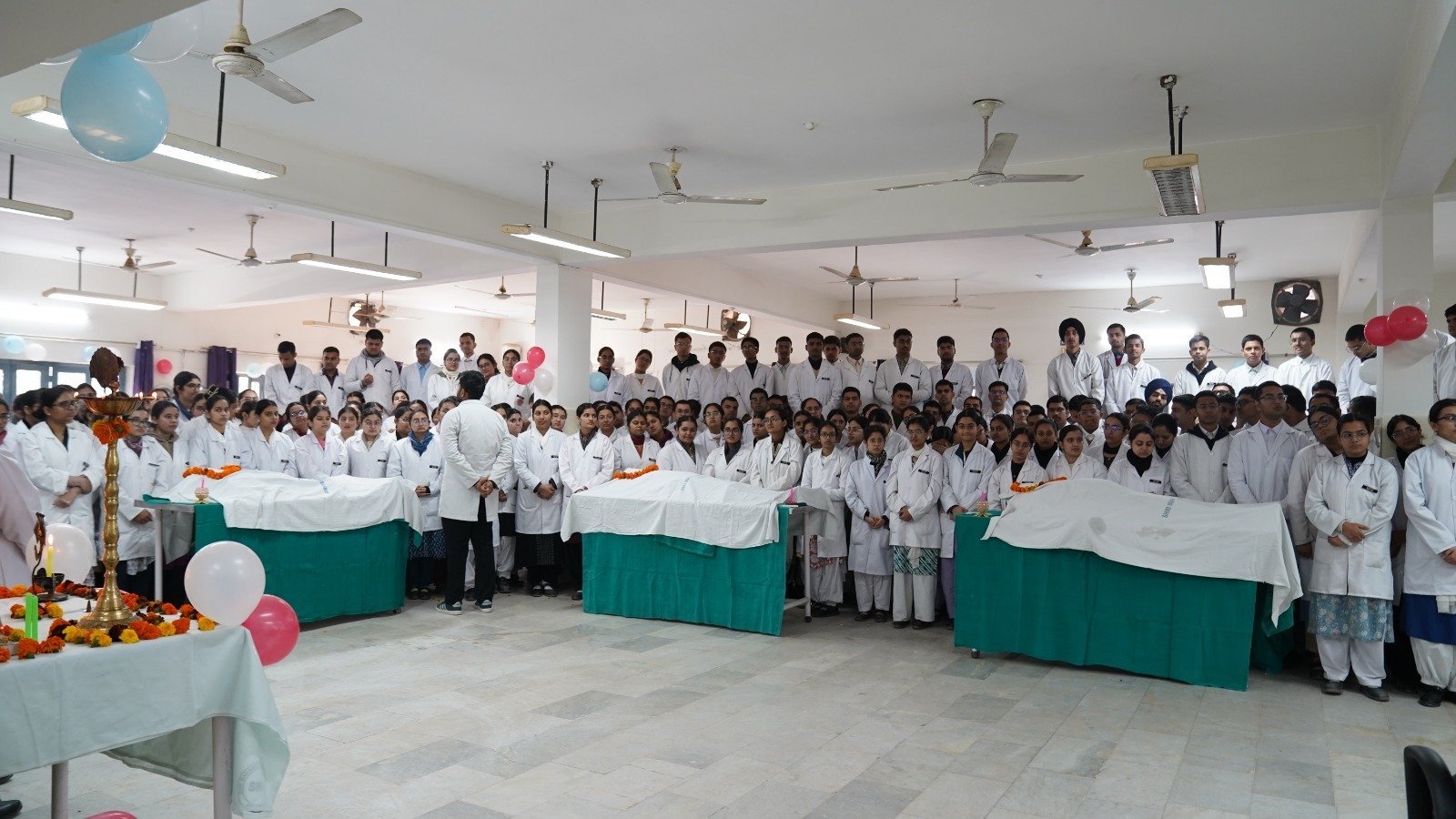 देहरादून : श्री गुरु राम राय इंस्टीटयूट ऑफ मेडिकल एंड हेल्थ सांइसेज (एसजीआरआरआईएमएण्डएचएस) देहरादून के एनाटाॅमी विभाग में एमबीबीएस 2025 बैच के नवप्रवेशित छात्र-छात्राओं के लिए कैडैवरिक ओथ (शव प्रतिज्ञा) समारोह का आयोजन किया गया। इस कार्यक्रम का उद्देश्य छात्र-छात्राओं को बाॅडी डोनेशन (शरीर दान) के महत्व से अवगत कराना और चिकित्सा शिक्षा में कैडैवर को प्रथम शिक्षक के रूप में सम्मान देने की भावना विकसित करना था।