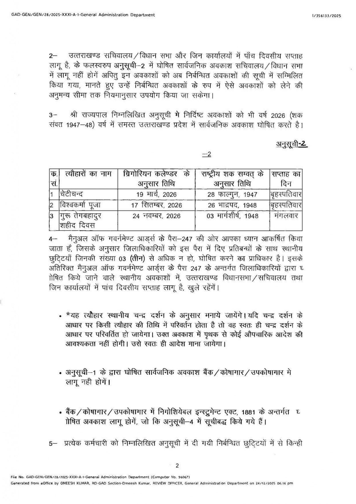देहरादून: उत्तराखंड में आगामी वर्ष 2026 के लिए शासन ने सार्वजनिक अवकाश का कैलेंडर जारी कर दिया है।