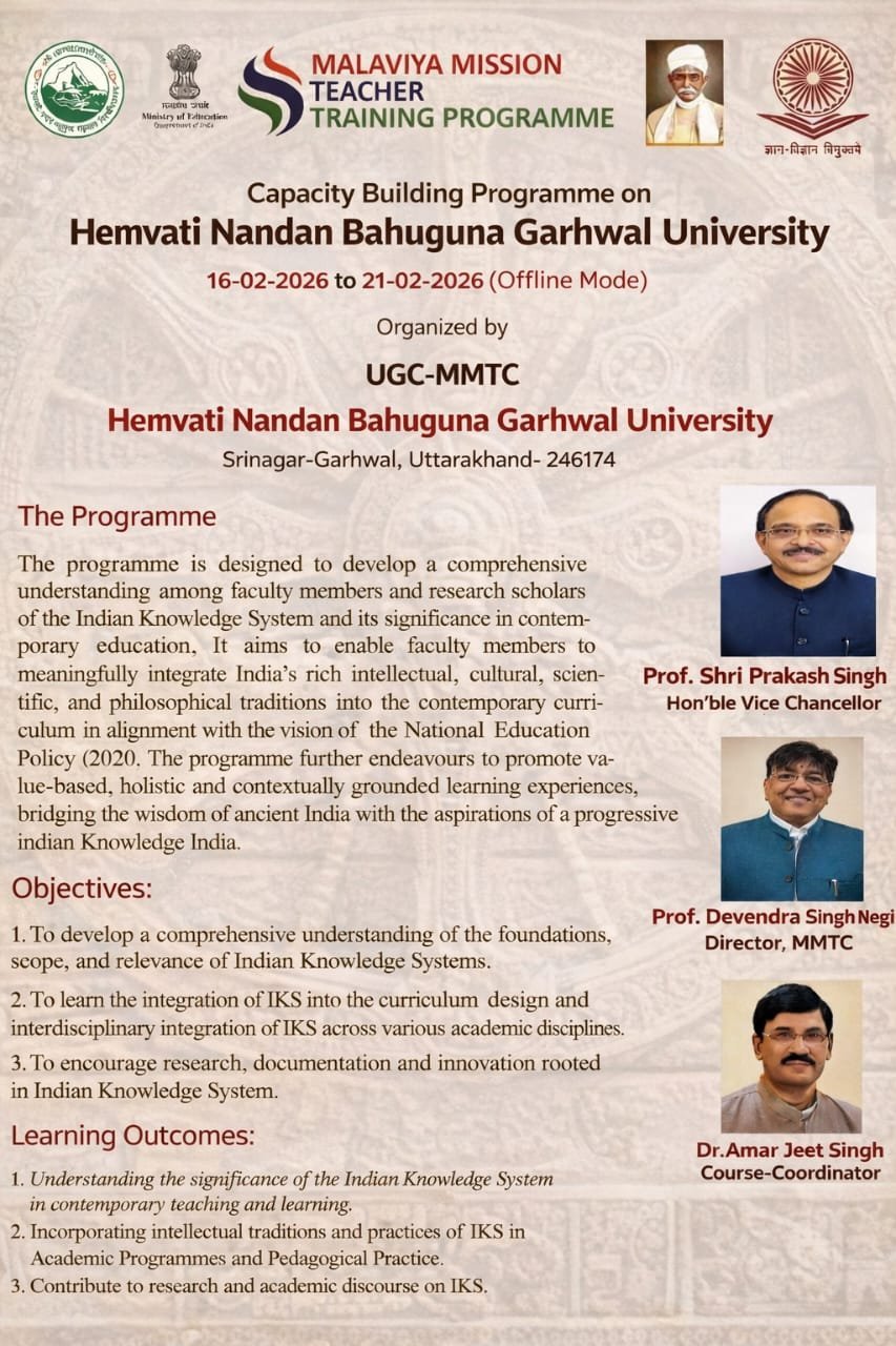 श्रीनगर : भारतीय ज्ञान परम्परा(IKS) के पाठ्यक्रम में प्रभावी एकीकरण के उद्देश्य से 16 फरवरी 2026 से 21 फरवरी 2026 तक एक विशेष क्षमता निर्माण कार्यक्रम का आयोजन किया जा रहा है। यह कार्यक्रम यूजीसी-मालवीय मिशन टीचर्स ट्रेनिंग सेंटर, हे.न.ब. गढ़वाल विश्वविद्यालय श्रीनगर द्वारा आयोजित होगा, जिसका कार्यक्रमस्थल – अकादमिक क्रियाकलाप केन्द्र चौरास परिसर रहेगा।