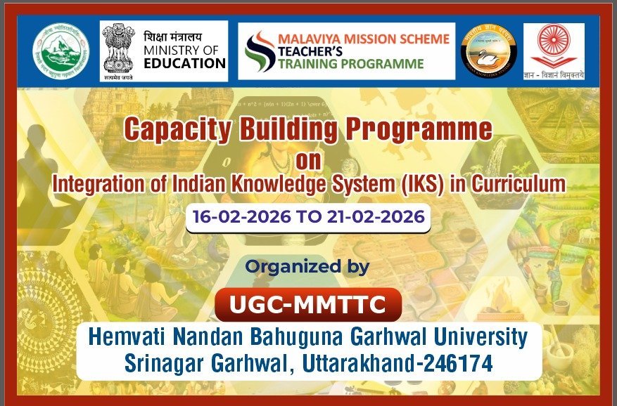 श्रीनगर : भारतीय ज्ञान परम्परा(IKS) के पाठ्यक्रम में प्रभावी एकीकरण के उद्देश्य से 16 फरवरी 2026 से 21 फरवरी 2026 तक एक विशेष क्षमता निर्माण कार्यक्रम का आयोजन किया जा रहा है। यह कार्यक्रम यूजीसी-मालवीय मिशन टीचर्स ट्रेनिंग सेंटर, हे.न.ब. गढ़वाल विश्वविद्यालय श्रीनगर द्वारा आयोजित होगा, जिसका कार्यक्रमस्थल – अकादमिक क्रियाकलाप केन्द्र चौरास परिसर रहेगा।