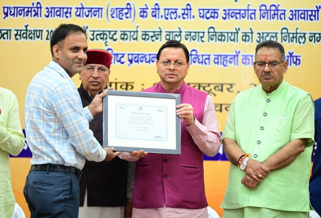 सीएम द्वारा स्वच्छता सर्वेक्षण 2024-25 में उत्कृष्ट कार्य करने वाले नगर निकायों को अटल निर्मल नगर पुरस्कार प्रदान किए गए। मुख्यमंत्री ने रुद्रपुर नगर निगम को प्रथम, पिथौरागढ़ नगर निगम को द्वितीय तथा कोटद्वार नगर निगम को तृतीय अटल निर्मल नगर पुरस्कार 2025 से सम्मानित किया | इसके साथ ही मसूरी नगर पालिका परिषद को प्रथम, डोईवाला नगर पालिका परिषद को द्वितीय तथा भीमताल को तृतीय अटल निर्मल नगर पुरस्कार 2025 से सम्मानित किया गया | मुख्यमंत्री ने लालकुआं नगर पंचायत को प्रथम, गुलरभोज नगर पंचायत को द्वितीय तथा भिकियासैंण नगर पंचायत को तृतीय अटल निर्मल नगर पुरस्कार 2025 से सम्मानित किया | उन्होंने छावनी परिषद लैंसडौन को प्रथम, रानीखेत को द्वितीय तथा रुड़की छावनी परिषद को तृतीय अटल निर्मल नगर पुरस्कार 2025 से सम्मानित किया |