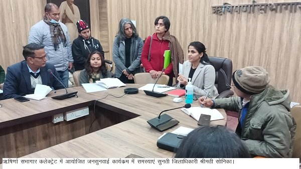 देहरादून : जिलाधिकारी सोनिका की अध्यक्षता में ऋषिपर्णा सभागार कलेक्ट्रेट में जनसुनवाई का आयोजन किया गया आज जनसुनवाई में 76 शिकायतें प्राप्त हुई, जिनमें अधिकतर शिकायतों का मौके पर ही निस्तारण किया गया। आज प्राप्त शिकायतों में भूमि कब्जा, अतिक्रमण, शस्त्र लाईसेंस नवीनीकरण, सिंचाई गूल पर अतिक्रमण, पेयजल एवं सीवर कार्यों के उपरान्त सड़क का समतलीकरण किए जाने, आपदा के दौरान क्षतिग्रस्त परिसर का आंगणन कराने, भारतीय नागरिकता हेतु किए गए आवेदन पर शीघ्र कार्यवाही करने, विद्युत बीजक माफ करने आदि शिकायतें प्राप्त हुई।