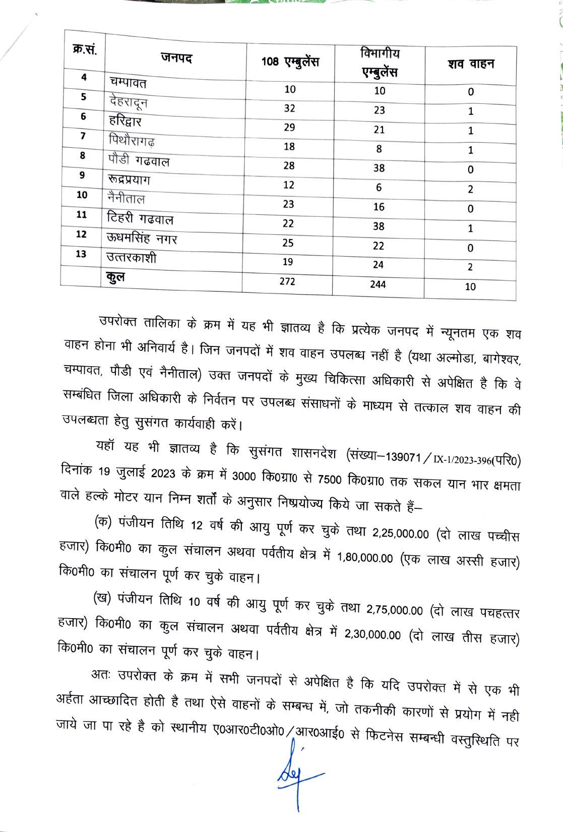 वर्तमान में राज्य में कुल 272 “108 एम्बुलेंस”, 244 विभागीय एम्बुलेंस और केवल 10 शव वाहन कार्यरत हैं। कुछ जिलों– जैसे अल्मोड़ा, बागेश्वर, चंपावत, पौड़ी और नैनीताल में शव वाहन नहीं हैं। इन जिलों के CMO को तत्काल वैकल्पिक व्यवस्था सुनिश्चित करने को कहा गया है। स्वास्थ्य सचिव ने बताया कि पुराने वाहन जिनकी रजिस्ट्रेशन आयु 10 या 12 वर्ष पूर्ण हो चुकी है, उन्हें नियमानुसार शव वाहन के रूप में तैनात किया जा सकता है। इसके लिए क्षेत्रवार संचालन व्यय भी निर्धारित कर दिया गया है।