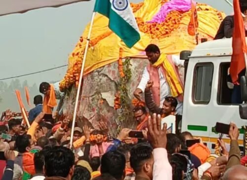 मधुबनी : देवशिला यात्रा सोमवार को मधुबनी जिले के जठही बॉर्डर पहुंची. इसे देखने के लिए काफी संख्या में लोगों की भीड़ उमड़ पड़ी. लोगों में एक बार इसे छू कर प्रणाम करने की होड़ मची रही। अयोध्या में श्रीराम जन्मभूमि पर बनने वाले मंदिर का निर्माण तेजी से हो रहा है. राम मंदिर में स्थापित होने वाली भगवान राम, मां जानकी की मूर्ति को तराशने के लिए 40 टन वजनी पत्थर के दो विशाल टुकड़ों को ले जाने वाली देवशिला यात्रा सोमवार को नेपाल से भारत के मधुबनी जिले के जठही बॉर्डर पहुंची. नेपाल की काली गंडकी नदी के दामोदर कुंड से शालिग्राम की दो देवशिलाएं लाई जा रही हैं.