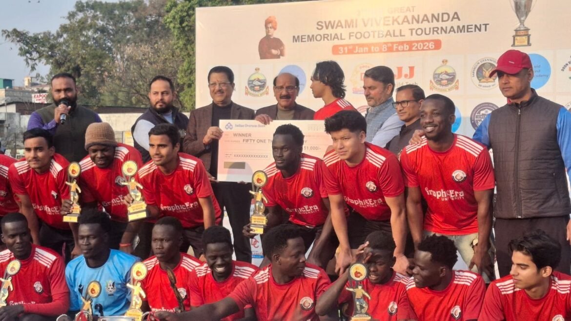 देहरादून। सर्वगुण ज्ञानोदय ट्रस्ट द्वारा आयोजित तृतीय ‘द ग्रेट स्वामी विवेकानंद मेमोरियल फुटबॉल टूर्नामेंट’ का रोमांचक समापन हो गया। फाइनल मुकाबले में ग्राफिक एरा एफसी ने दून चैलेंजर्स को अतिरिक्त समय में दागे दो गोलों की बदौलत 2-0 से मात देकर खिताब अपने नाम किया।