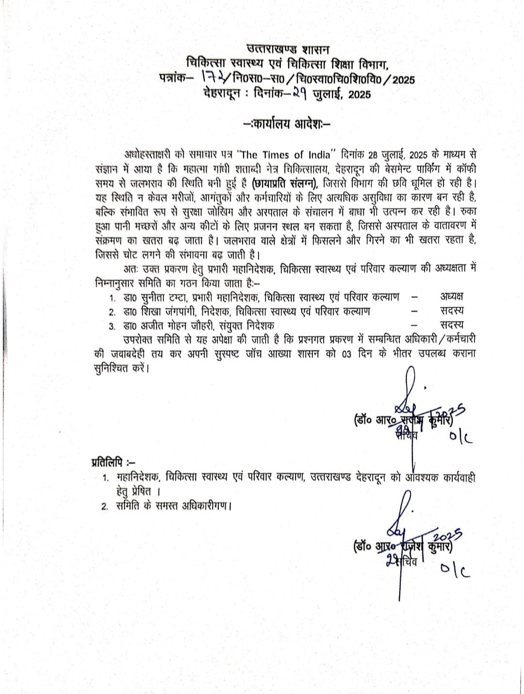 - जलभराव पर सचिव ने तीन सदस्यीय जांच समिति गठित कर तीन दिवस में रिपोर्ट तलब की