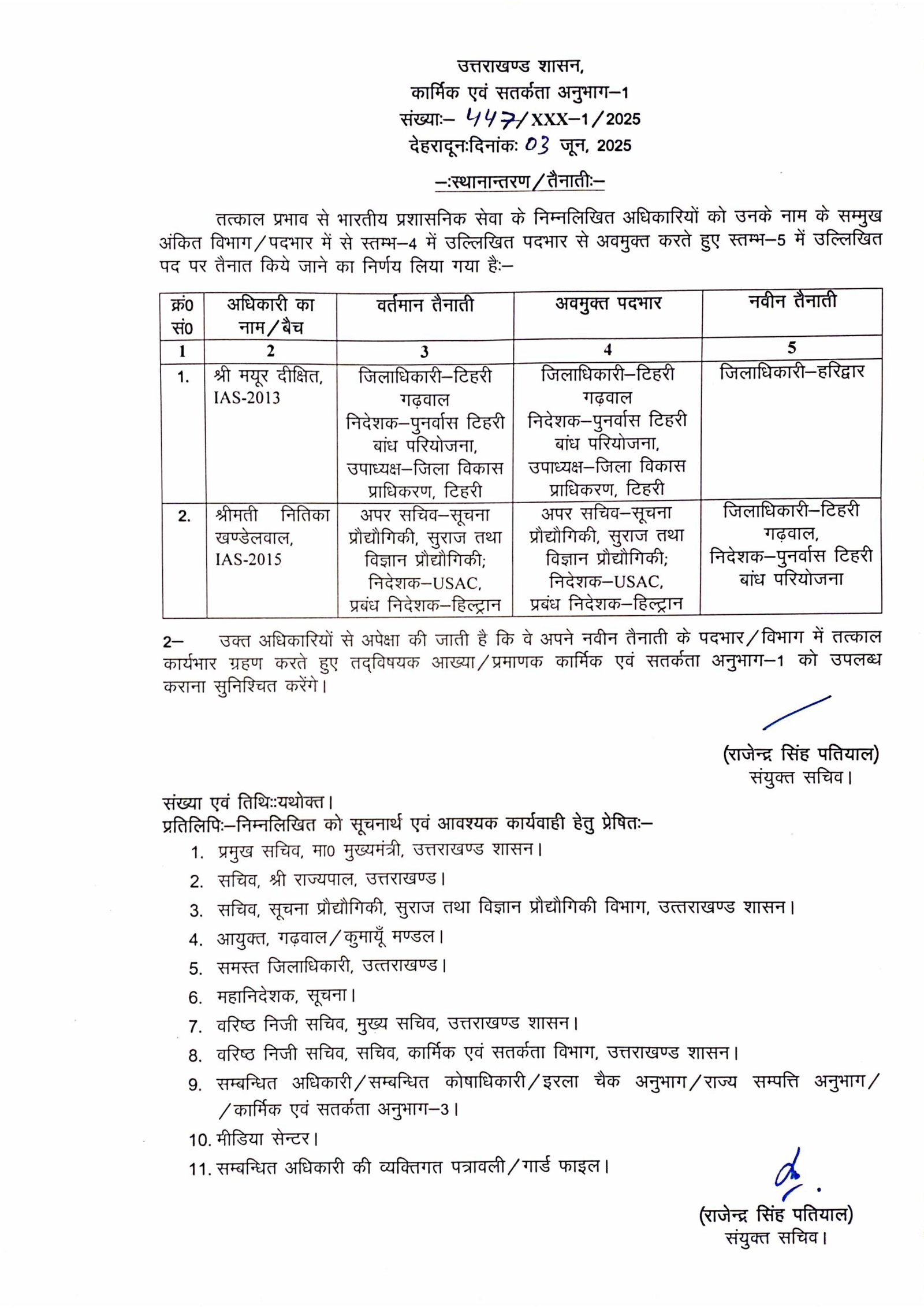 देहरादून। उत्तराखंड शासन ने प्रशासनिक सेवा में एक बार फिर बड़ा फेरबदल करते हुए आईएएस अधिकारियों के तबादले किए हैं। IAS मयूर दीक्षित को हरिद्वार का नया जिलाधिकारी नियुक्त किया गया है। इससे पहले वे टिहरी गढ़वाल में जिलाधिकारी के पद पर कार्यरत थे। वहीं साल 2015 बैच की आईएएस अधिकारी नीतिका खंडेलवाल को टिहरी गढ़वाल जिले का जिलाधिकारी नियुक्त किया गया है। इसके साथ ही आईएएस नीतिका को निदेशक, पुनर्वास टिहरी बांध परियोजना की भी जिम्मेदारी सौंपी गई है।