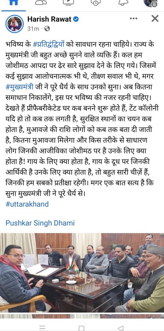 देहरादून। पूर्व मुख्यमंत्री हरीश रावत गाहे बगाहे मुख्यमंत्री पुष्कर सिंह धामी की तारीफ करते रहते हैं। आज उन्होंने जो फेसबुक पोस्ट की है, उसके मायने निकाले जाए तो हरदा सीएम धामी में बडी संभावना देखते हैं। अब जोशीमठ के मुद्दे पर सीएम धामी को अपरोक्ष रूप से विपक्ष के सबसे बड़े नेता हरीश रावत का साथ मिला है। दरअसल, बीते रोज पूर्व सीएम हरीश रावत के नेतृत्व में कांग्रेसी सीएम से मिलने गए थे। इस दौरान जोशीमठ को लेकर कांग्रेस नेताओं ने तमाम शंकाओ को सीएम के समक्ष रखा जिन्हें मुख्यमंत्री ने काफी गंभीरता पूर्वक सुना। अब, आज पूर्व सीएम हरीश रावत ने सोशल मीडिया पर एक पोस्ट साझा कर सीएम के रवैये की जमकर तारीफ की है।