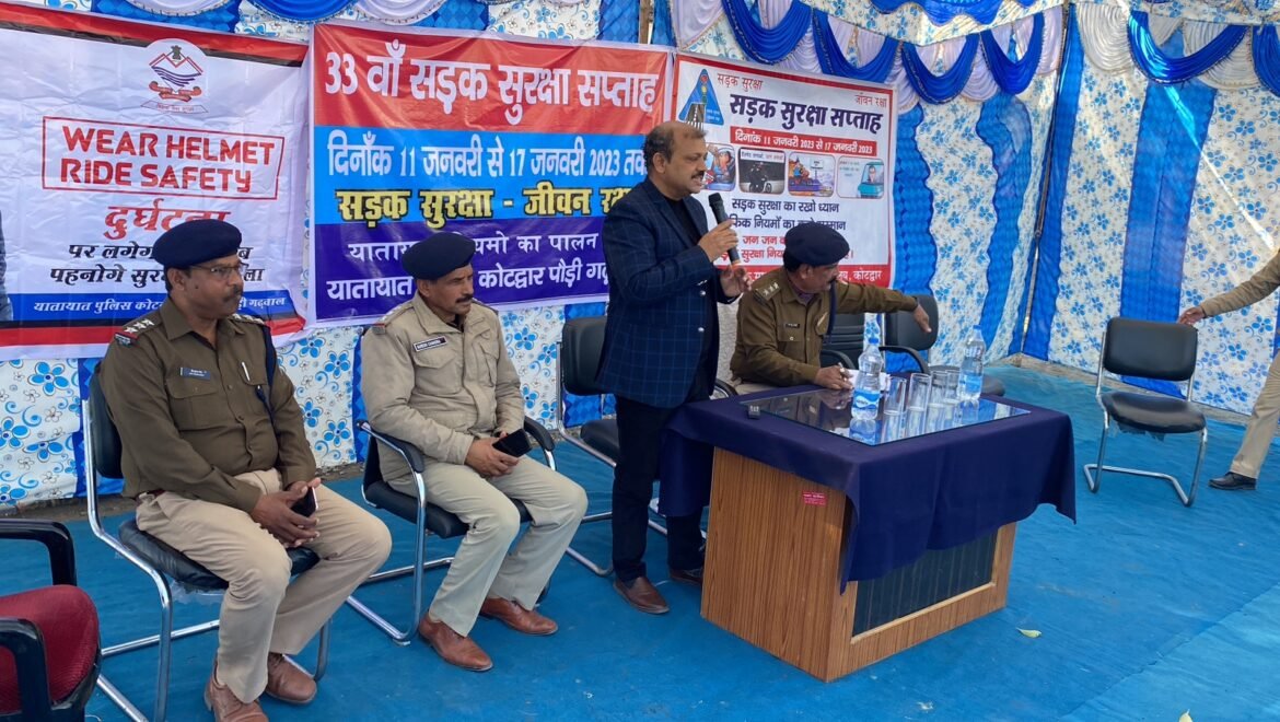 कोटद्वार। 33 वें सड़क सुरक्षा सप्ताह का आयोजन 11 से 17 जनवरी तक संपूर्ण भारतवर्ष में किया जा रहा है। इसी क्रम में जनपद पौड़ी गढ़वाल में वरिष्ठ पुलिस अधीक्षक पौड़ी श्वेता चौबे के निर्देशन और अपर पुलिस अधीक्षक कोटद्वार शेखर चन्द सुयाल एवं पुलिस क्षेत्राधिकारी गणेश लाल कोहली के नेतृत्व में सड़क सुरक्षा सप्ताह के दूसरे दिन गुरुवार को यातायात कार्यालय कोटद्वार में उप संभागीय परिवहन अधिकारी कोटद्वार पंकज श्रीवास्तव ने मुख्य अतिथि के तौर पर व्यवसायिक, बस, ऑटो, टैक्सी एवं अन्य वाहन चालकों को डीएल निरस्तीकरण की कार्यवाही के साथ साथ यातायात नियमों के प्रति जागरूक करने का कार्यक्रम बड़े उत्साह के साथ किया गया।इसके अलावा पुलिस क्षेत्राधिकारी जेएल कोहली एवं यातायात निरीक्षक शिव कुमार ने वाहन चालकों को जागरूकता संबंधी जानकारी दी । अग्निशमन अधिकारी कोटद्वार सुरेश चंद ने भी वाहन में आग लगने से बचाव के तरीको की जानकारी दी । कार्यक्रम में आम जनमानस व आटो, बस, टैक्सी इत्यादि वाहन चालक मौजूद रहे।