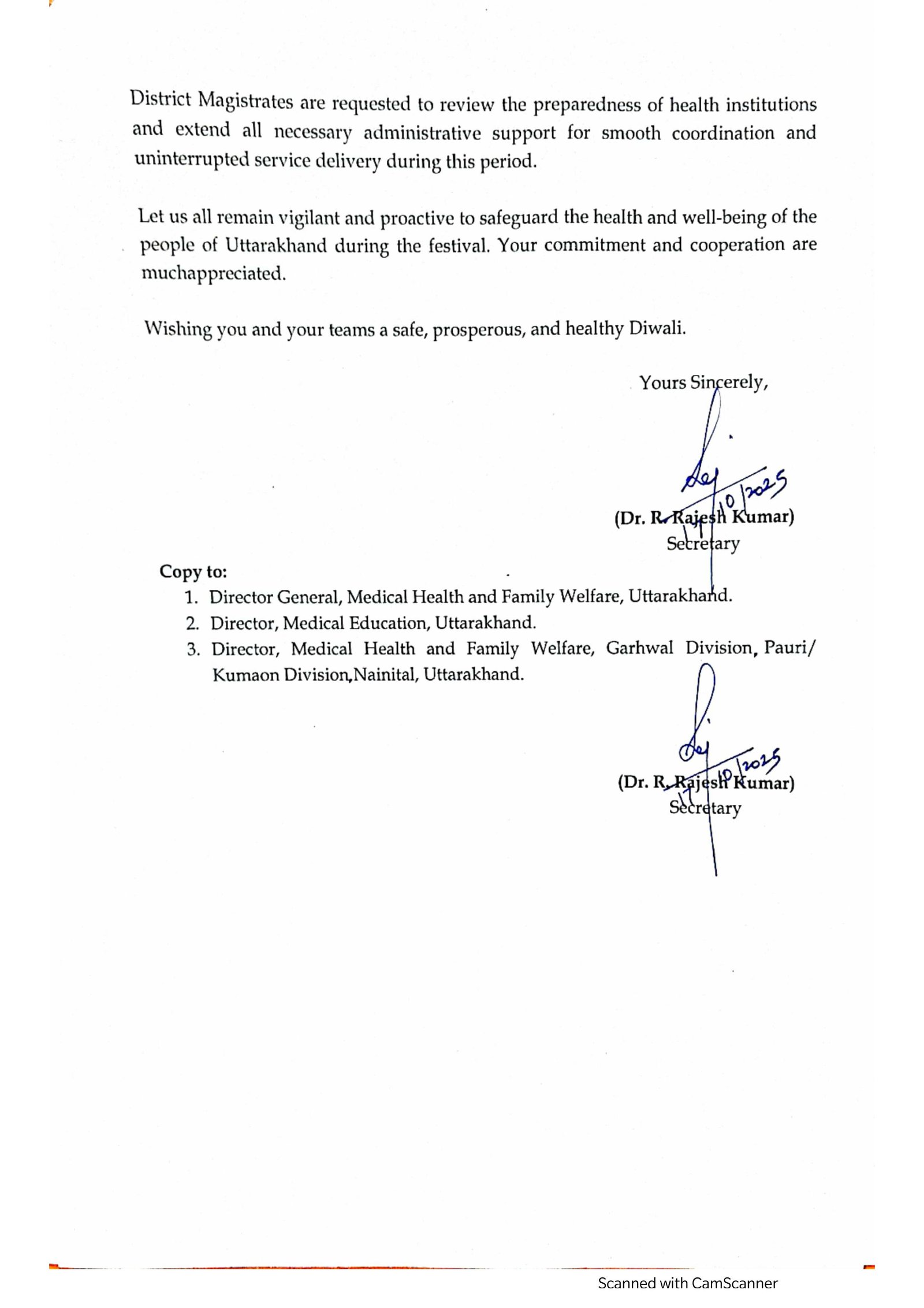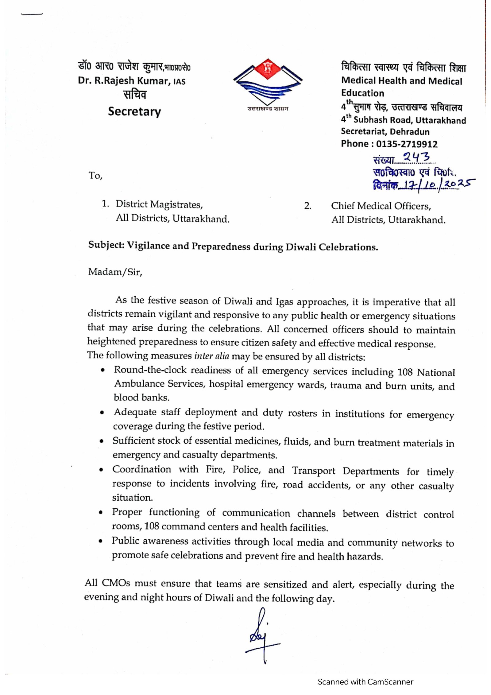 स्वास्थ्य सचिव डॉ. आर. राजेश कुमार ने स्पष्ट किया कि विभाग का उद्देश्य केवल उपचार देना नहीं, बल्कि समय पर राहत और रोकथाम सुनिश्चित करना भी है। उन्होंने कहा कि दीपावली और इगास पर्व के दौरान विभाग पूरी तत्परता से कार्य करेगा ताकि किसी भी आपात स्थिति में त्वरित सहायता उपलब्ध हो सके। उत्तराखंड स्वास्थ्य विभाग ने सभी नागरिकों से अपील की है कि वे पर्वों की खुशियाँ जिम्मेदारी के साथ मनाएँ, दूसरों की सुरक्षा का भी ध्यान रखें और किसी भी आपात स्थिति में तुरंत मदद के लिए संपर्क करें।