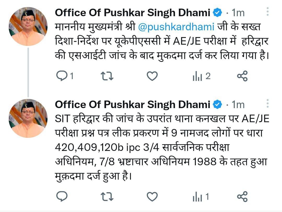 Home » Blog » सीएम पुष्कर सिंह धामी के सख्त निर्देश पर यूकेपीएससी में AE/JE परीक्षा में  हरिद्वार पुलिस की एसआईटी जांच के बाद हुआ मुकदमा दर्ज