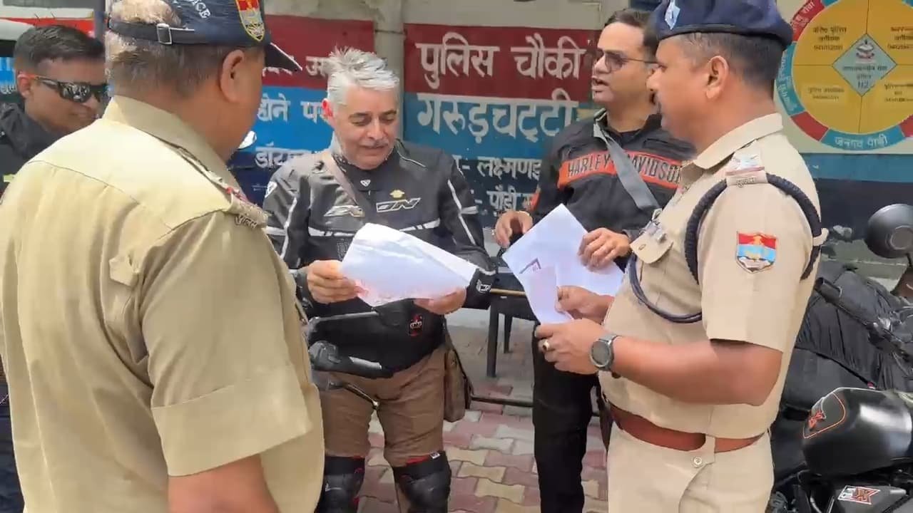 लक्ष्मणझूला : पुलिस कप्तान पौड़ी लोकेश्वर सिंह के द्वारा चार धाम यात्रा के दौरान सड़क दुर्घटनाओं पर प्रभावी अंकुश लगाने ओर सड़क सुरक्षा नियमों के पालन करने के लिए जनपद के सभी थाना प्रभारीयो को अपने अपने थाना क्षेत्र में स्थानीय लोगों ओर पर्यटकों के माध्यम से जन जागरूकता हेतु निर्देशित किया है जिसके तहत थानाध्यक्ष लक्ष्मणझूला संतोष पैथवाल के द्वारा आज गरुड़ चट्टी बैरियर पर हार्ले डेविडसन ग्रुप गुड़गांव हरियाणा के राइडर्स के साथ सड़क सुरक्षा के संबंध में जन जागरूकता पाॅपलेट्स वितरित किए गए तथा हिमालय यात्रा से वापस जा रहे राइडर्स से आग्रह किया गया कि वह अपनी आगे की यात्रा के दौरान अलग–अलग स्थानों पर वितरित पाॅपलेट के द्वारा स्थानीय लोगों को सड़क सुरक्षा के संबंध में जागरूक करे,इस अवसर पर थानाध्यक्ष ने बताया की हम सभी को यातायात के नियमों का पालन करते सुगम यातायात का प्रयास करना चाहिए, जिससे सड़क दुर्घटनाओं पर प्रभावी अंकुश लग सके। पुलिस टीम में उप निरी0 अभिनव शर्मा, का. निर्मल,मनोहरी,पंकज ओर सुनील शामिल रहे।
