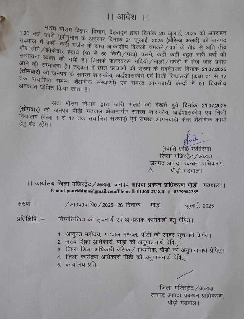 पौड़ी : जिलाधिकारी स्वाति एस. भदौरिया बारिश के अलर्ट को देखते हुये जनपद में संचालित सभी शासकीय, अर्द्धशासकीय व निजी विद्यालयों (कक्षा 1 से 12 तक) एवं समस्त आंगनबाड़ी केंद्रों में 21 जुलाई को एक दिवसीय अवकाश घोषित किया है।  जिलाधिकारी ने समस्त संबंधित विभागों को अलर्ट मोड में रहने के निर्देश भी दिये हैं। उन्होंने आम जनता से अपील की है कि वे ख़राब मौसम के दौरान अनावश्यक रूप से घर से बाहर न निकलें और किसी भी आपात स्थिति में प्रशासन से संपर्क करें। उन्होंने विशेष रूप से संवेदनशील व आपदा संभावित क्षेत्रों में सतर्कता बरतने और जल स्रोतों के नजदीक न जाने की सलाह दी है। साथ ही उन्होंने मुख्य शिक्षा अधिकारी को सभी स्कूलों में अवकाश की सूचना समय पर देने के निर्देश दिये हैं।