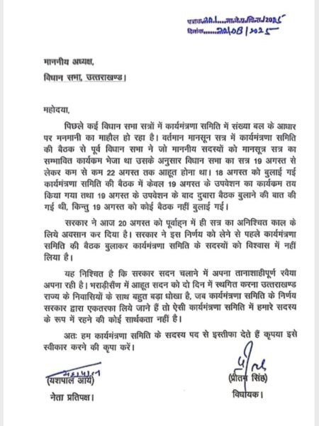 यशपाल आर्य ने आरोप लगाया कि सरकार सदन संचालन में “तानाशाही रवैया” अपना रही है और जब समिति के निर्णयों की अनदेखी हो रही है, तब समिति में बने रहने का कोई औचित्य नहीं रह जाता।