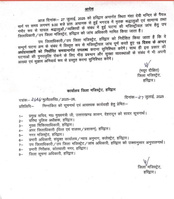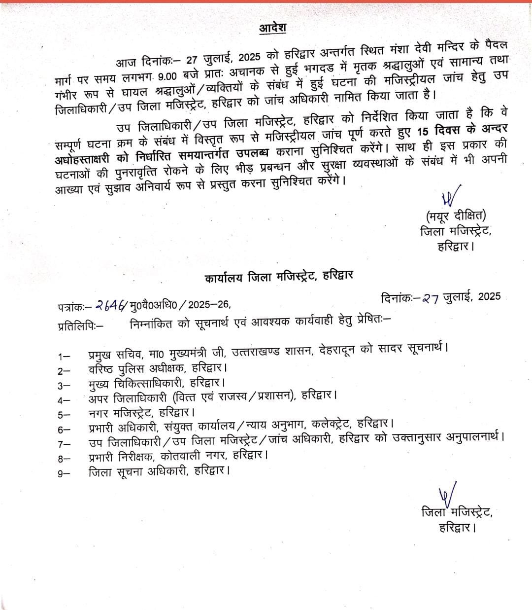 हरिद्वार : आज 27 जुलाई, 2025 को हरिद्वार अन्तर्गत स्थित मंशा देवी मन्दिर के पैदल मार्ग पर समय लगभग 9.00 बजे प्रातः अचानक से हुई भगदड में मृतक श्रद्धालुओं एवं सामान्य तथा गंभीर रूप से घायल श्रद्धालुओं / व्यक्तियों के संबंध में हुई घटना की मजिस्ट्रीयल जांच हेतु उप जिलाधिकारी / उप जिला मजिस्ट्रेट, हरिद्वार को जांच अधिकारी नामित किया जाता है।