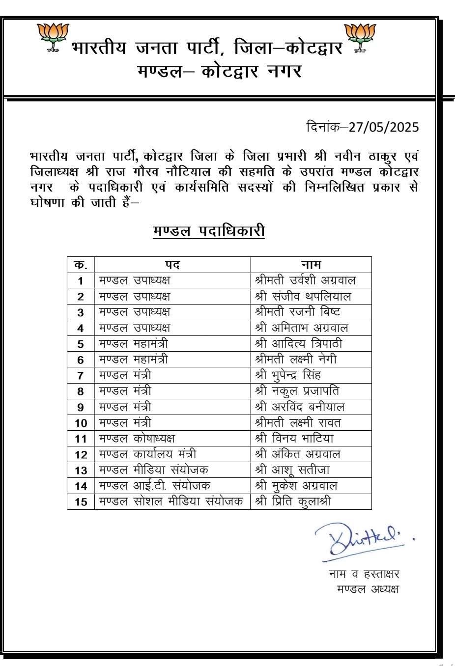 Home » Blog » कोटद्वार : भाजपा नगर मंडल की कार्यकारिणी घोषित, देखें सूचि ………