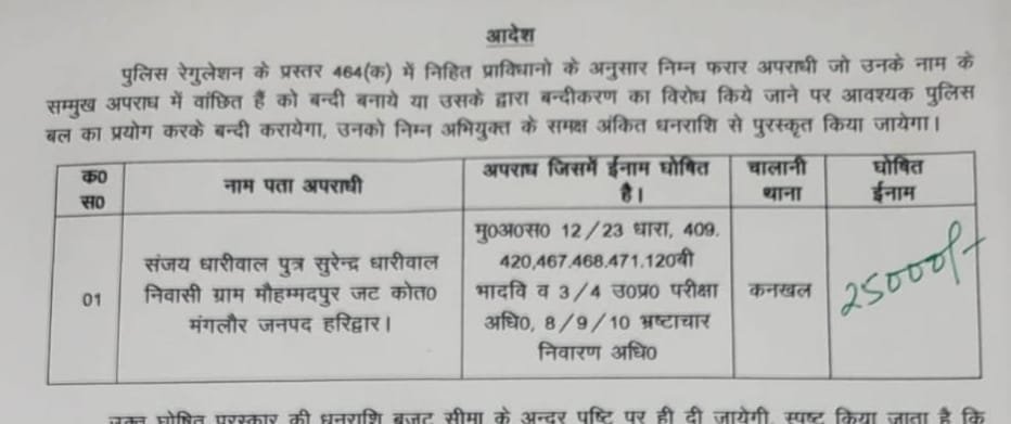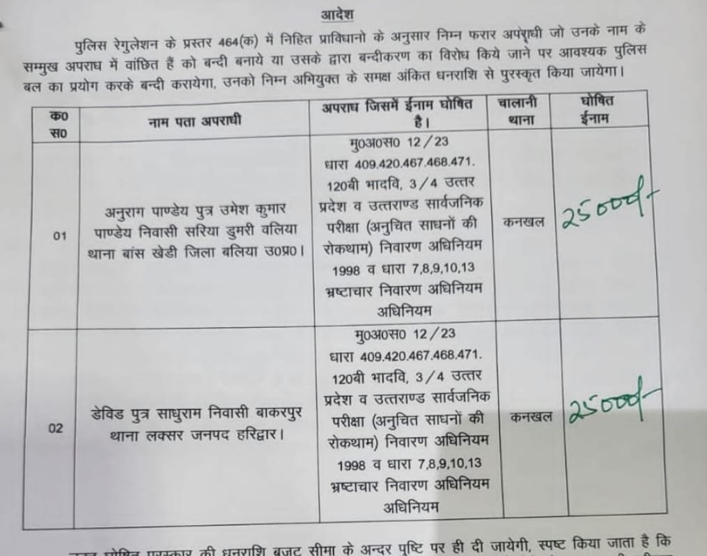 हरिद्वार : कथित मंगलौर निवासी नेता सहित तीन की गिरफ्तारी पर पुलिस कप्तान ने तय किए इनाम। इनाम जारी होते ही बहस पहुंची चरम पर, कथित इनामी के छुपने के लिए भटकते फिरने की मिल रही खबर । परेशान युवाओं की चिंताओं को लेकर कप्तान अजय सिंह भी हैं फिक्रमंद, न्याय दिलाने का जताया भरोसा। पेपर कांड से परेशान नौजवानों की भावनाओं को समझते हुए जांच की पल पल खबर रख रहे पुलिस कप्तान अजय सिंह ने पेपर कांड में छिपने के लिए दर-दर भटक रहे तीन आरोपियों की मुश्किल कई गुना करते हुए अभियुक्तों पर इनाम राशि घोषित की। ताजातरीन आदेश करते हुए पुलिस कप्तान ने नामचीन अभियुक्त संजय सहित अनुराग और डेविड पर पच्चीस-पच्चीस हजार रुपये ₹25000/- के इनाम घोषित किए। न्याय तलाश रहे युवाओं के लिए संजीवनी बने इस आदेश के बाद माफिया और उनके गुर्गे परेशान हैं। जल्द सभी वांछित की गिरफ्तारी तय।