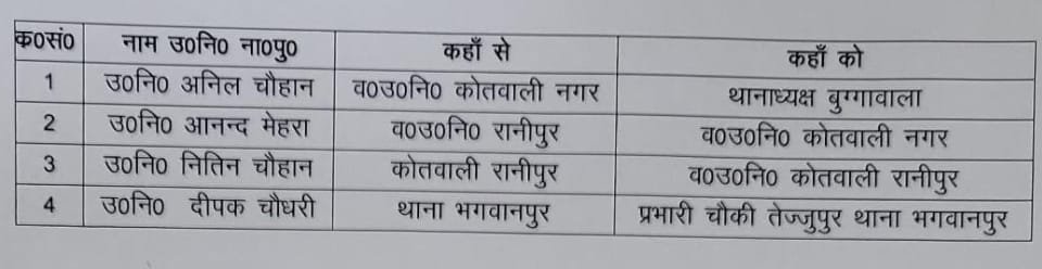हरिद्वार : एसएसपी अजय सिंह ने 04 उपनिरीक्षकों के किये स्थानान्तरण, देखें सूचि
